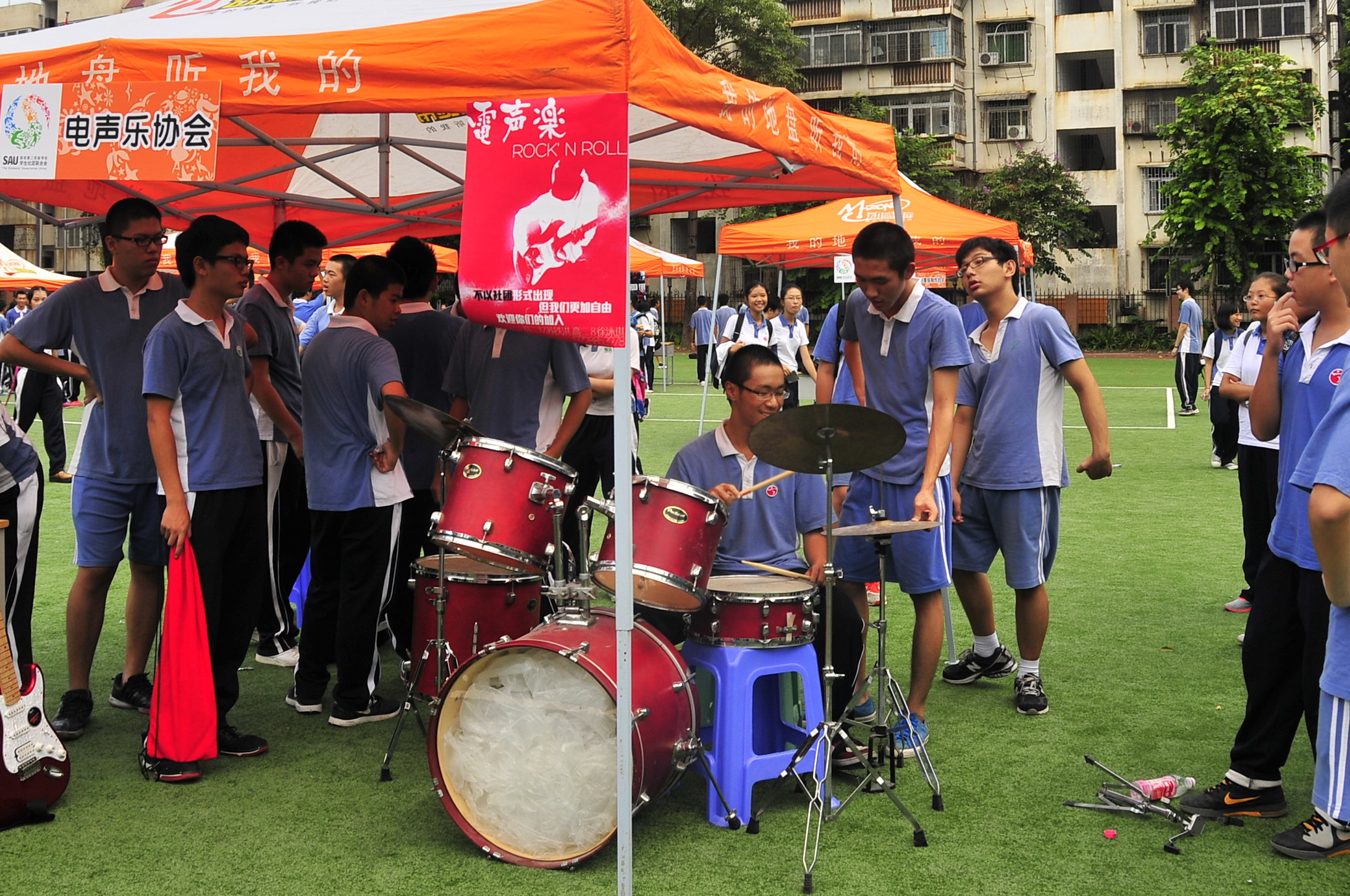 招新大会在高中部体育场举行。高年级的学长打出了精心设计的海报,热情地给学弟学妹介绍本社团的相关情况。新生们踊跃报名,或者在心仪的的社团展位前排起长龙,或者在各个展位前驻足打听,兴奋期待之情,溢于言表。社团的无边魅力,校园的无限活力,在招新大会上再次展现。