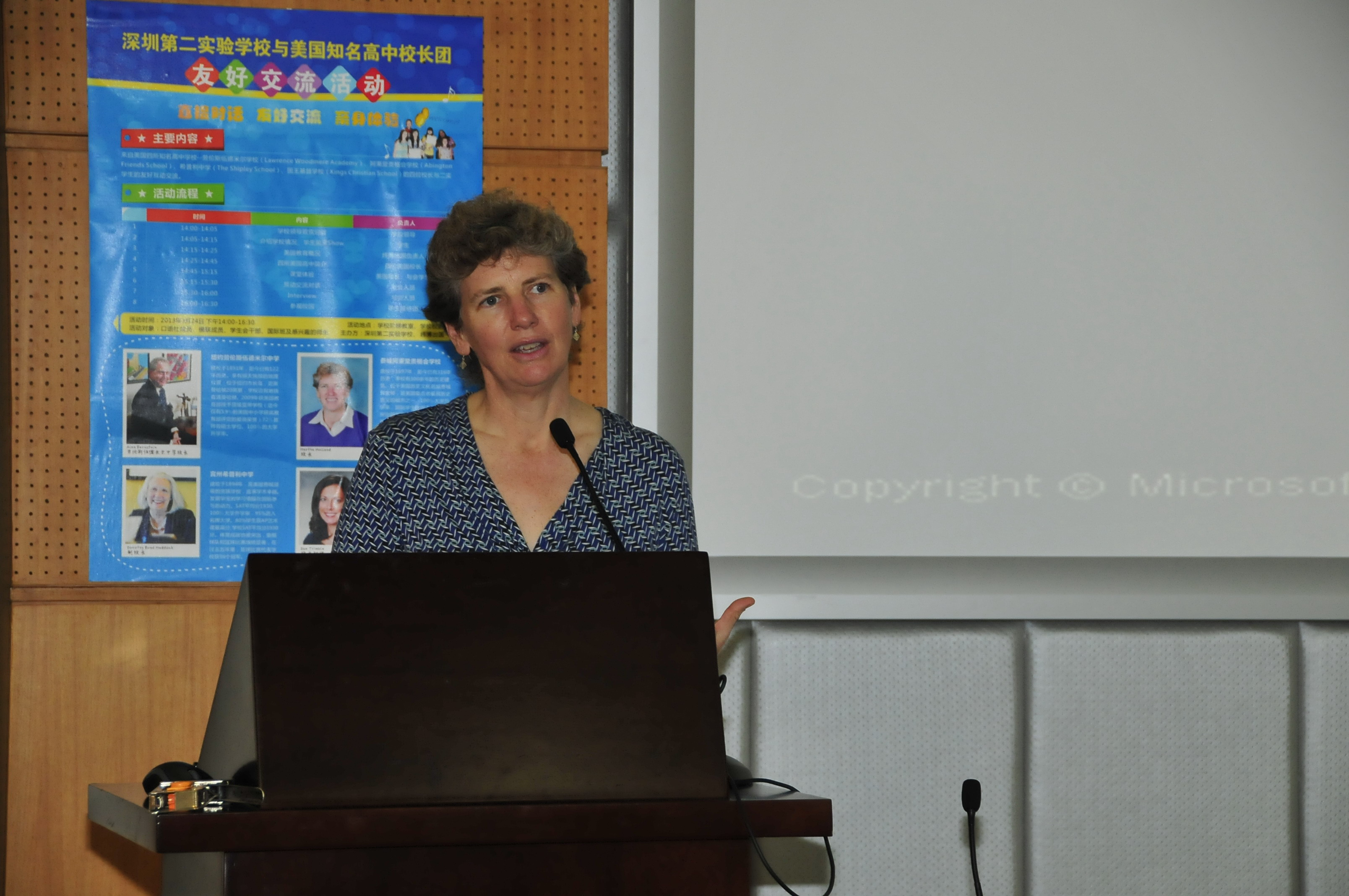 四位校长分别来自劳伦斯伍德米尔学校(Lawrence Woodmere Academy)、阿秉堂贵格会学校(Abington Friends School)、希普利中学(The Shipley School)、国王基督学校(Kings Christian School)。交流会由我校国际班学生主持,包括学生节目show、四所美国知名高中简介、美国课堂体验、互动交流对话及面试等环节,现场气氛轻松愉快。交流中,同学们的舞蹈和歌声赢得了在场嘉宾热烈的掌声;互动交流对话环节,同学们踊跃提问,标准流利的发音和纯正地道的腔调,展示出了高水平的英语语言能力;现场面试环节为同学们提供了一次难得的锻炼机会,同学们展现出来的综合素质得到四位美国校长的高度肯定。