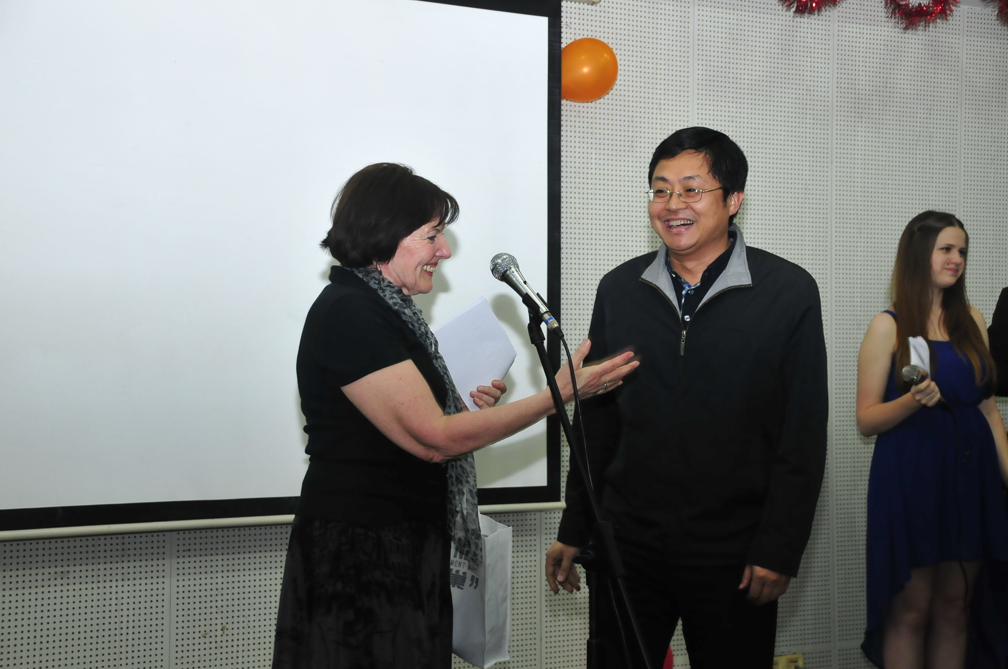 晚会还播放了记录着德国友人在深圳一周活动的视频,大家认真观看视频,回味着一个个欢乐瞬间。最后我校领导向德国亚琛安妮法兰克文理中学师生们赠送了富有中国特色“中国结”和毽球,以表达对德国友人的美好祝福。