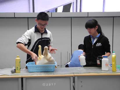 ◆化学魔术汇演 3月27 日下午,同学们期待已久的化学魔术表演在教学一楼大厅闪亮登场。高一和高二的十几组同学给大家带了几十个异彩纷呈的魔术实验,效果极其轰动!例如“大象的鼻子”、“彩色冰激淋”、“法老之响”、“点不着的抹布”、“火山爆发”、“水下星火”、“火山爆发”等等,吸引大量同学围观和参与。通过大厅的电子屏幕实况转播,六层的教学大厅走廊上都挤满了津津有味欣赏的同学。当最后一组同学坚持完成了耗时长但非常有意义的七色焰火实验,他们执着、专业的态度获得了热烈的掌声。此次化学魔术表演高一和高二的学生都做了若干次预演、充分的准备,化学科组老师们也多次到场指导,保证大家的安全,加上电教部老师的积极配合,化学魔术大会顺利结束。