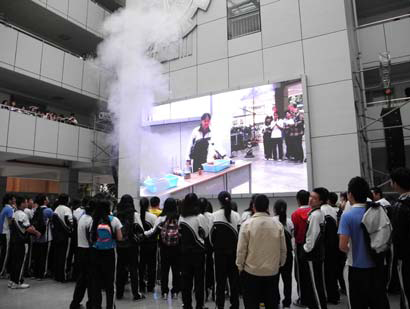 化学魔术汇演吸引众多观众 电子大屏幕实况转播