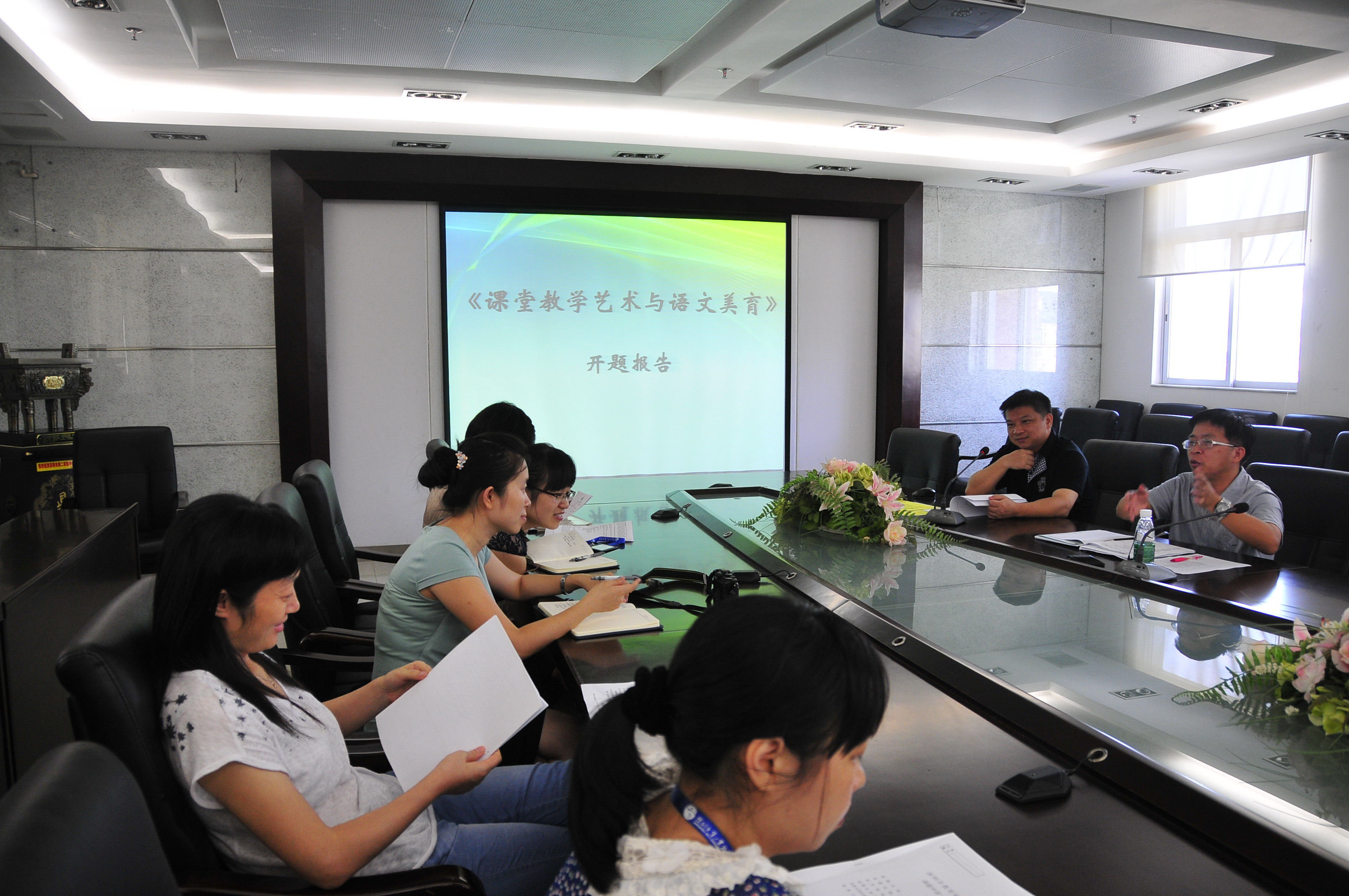 开题会上,课题主持人汇报了本课题的研究背景、研究现状、研究意义、研究目标,结合研究内容和教学实际对研究过程中的人员分工和阶段性任务作了安排。其中丁雪芬老师的《针对学生差异的高中生物课分层教学研究与实践》主要通过对个案、群体的研究和分层教学策略的实施,在科组教师间共同构建教学手段和方法,探索具有本校特色的高中生物课堂分层教学的有效途径;高中学生处主持的《广东特色学校德育创新发展模式研究》力求探索出更加科学有效的德育教育方法和途径、提高德育的实效性以适应教育教学形势及未来社会的发展,更好的为教学质量服务,进一步丰富学校德育创新及德育改革等方面的理论;羊巨波老师的《论交往式阅读教学》针对目前高中语文阅读教学存在比较严重的主体性缺失、人文性缺失的病理性现象探索构建多主体、多层次,多角度的立体化交往式的阅读网络状态;李刚老师的《课堂教学艺术与语文美育》从青少年成长、时代和语文教学本身的需要出发,追求语文教学中美育的理想境界,促进教师和学生的终生幸福感;陈箐老师的《高中历史课堂教师知识管理的行动研究》着眼于在教学行动中研究、探索历史教师进行知识管理的方法、策略,通过显性知识系统化、隐性知识显性化促进教师的知识增值和实践智慧,从而促进教与学方式的变革,推动有效教学的实现。