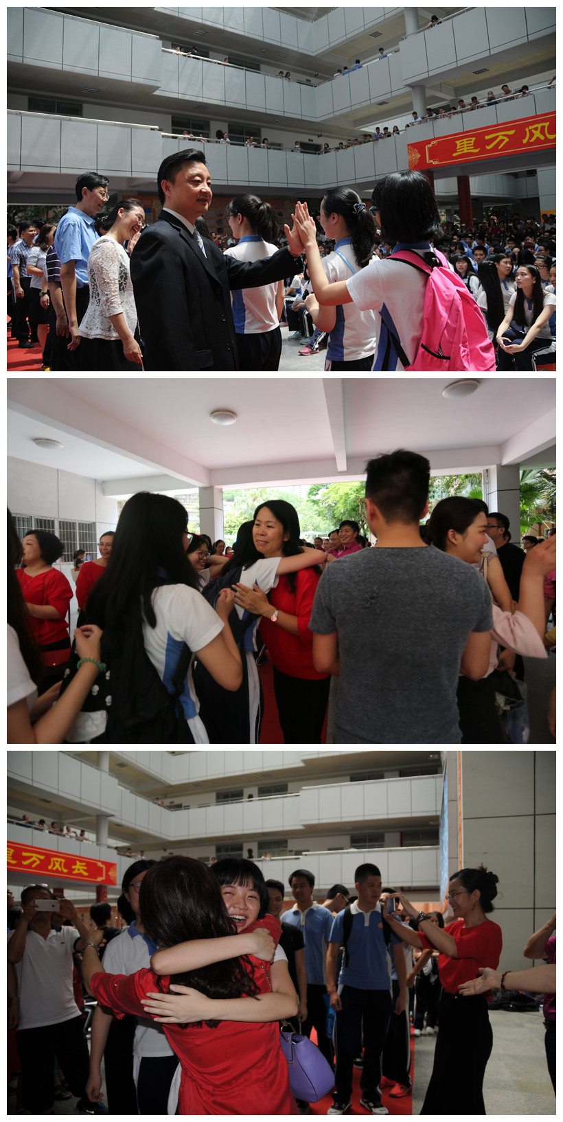典礼最后,鲁江校长率领校领导、中层干部、高三年级的全体教师列队与走过红地毯与2016届高中毕业生们或击掌、或握手、或拥抱,一一相送告别;或微笑、或泪水、或感恩、或嘱托......情真意切、感人至深,将毕业典礼的气氛推向了顶点。