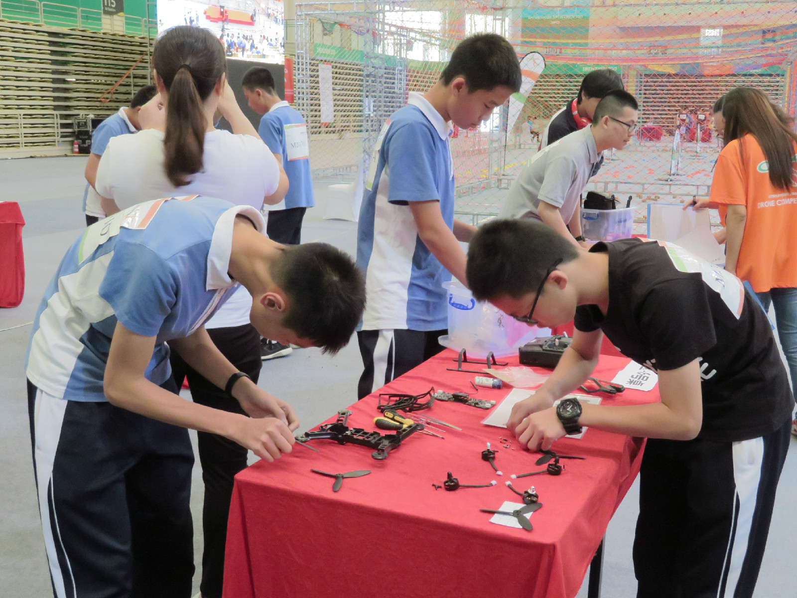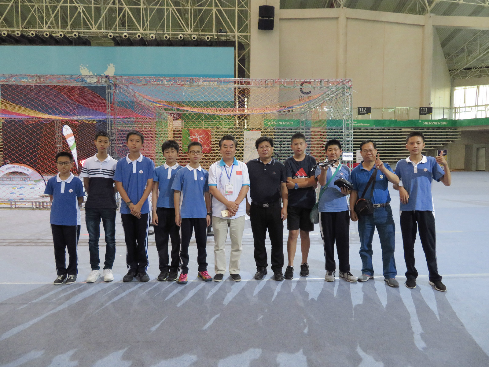 本次大赛响应《深圳市中小学科技创新教育三年行动计划(2015-2017年)》中,以机器人和科技创新发明竞赛为重点,在中小学生中广泛推广科技创新发明,结合竞赛寓教于乐,力争把深圳市打造成青少年科技创新竞赛的高端品牌,使深圳成为全国乃至国际科技创新竞赛定期举办的城市之一。大赛共有83支代表队,258名来自全国各地的选手、近百名指导老师比赛经过各队的组装赛、障碍赛、任务赛三轮激烈竞技,决出了一等奖一个队,二等奖三个队,三等奖五个队。我校初中部由初二4吴文骢、初二10史豪、初二14班的刘灯城和刘建晖等4人组成的空模一队获得三等奖,由初一6刘迪、初一11刘恒安和初二7熊町键等组成的空模二队获得优胜奖。吴文骢同学在任务赛中一人遥控无人机挑放12“箱”木块,展现出高超的遥控水平。
