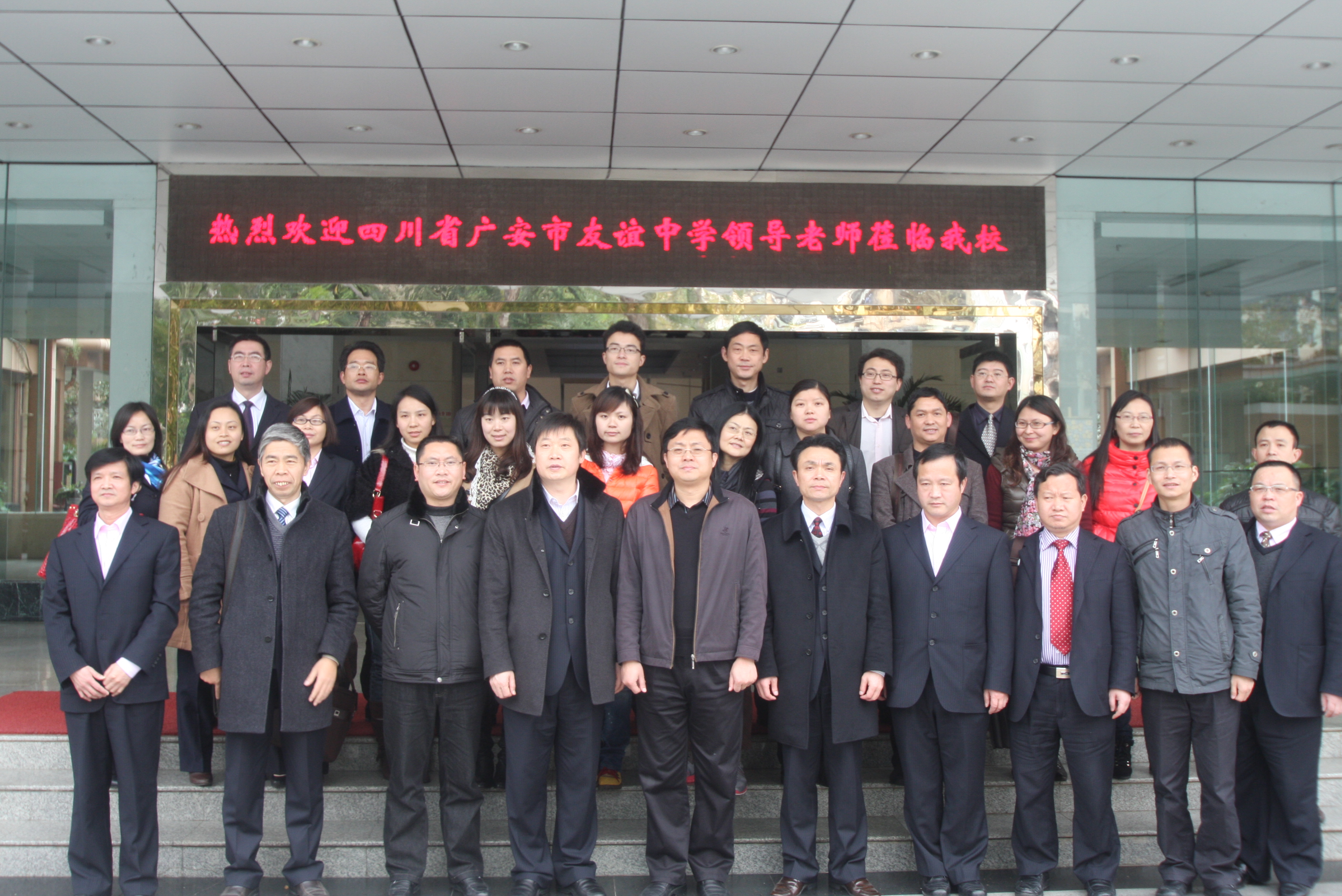 2月29日上午,四川省广安市友谊学校的领导、老师一行30余人在该校谢德文校长的率领下莅临我校交流访问,赵立校长亲自接待了来自中国改革开放总设计师——邓小平故里的同行。在两校的交流会上,赵校长向客人们介绍了我校的发展情况,并从严格学校管理、建设优秀团队、理顺课程体系、教师专业成长、特色优势项目、缤纷社团活动、教学方式探索等方面交流了学校多特色建设的实践和体会。谢德文校长也在会上介绍了广安友谊学校。这所直属广安市政府的学校,经过16年的办学,快速发展,现已是硕果满枝、桃李芬芳,美名享誉巴山蜀水。