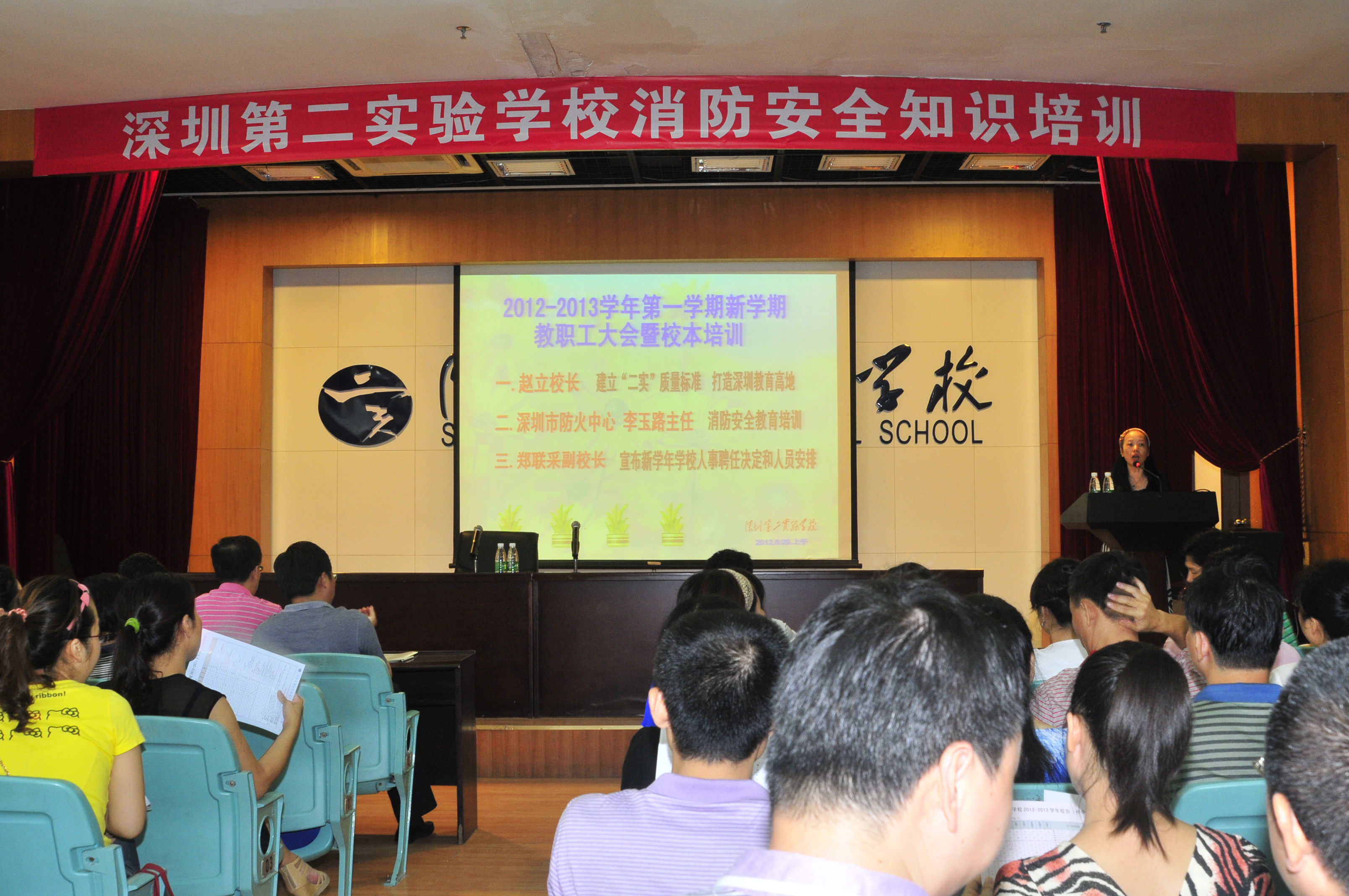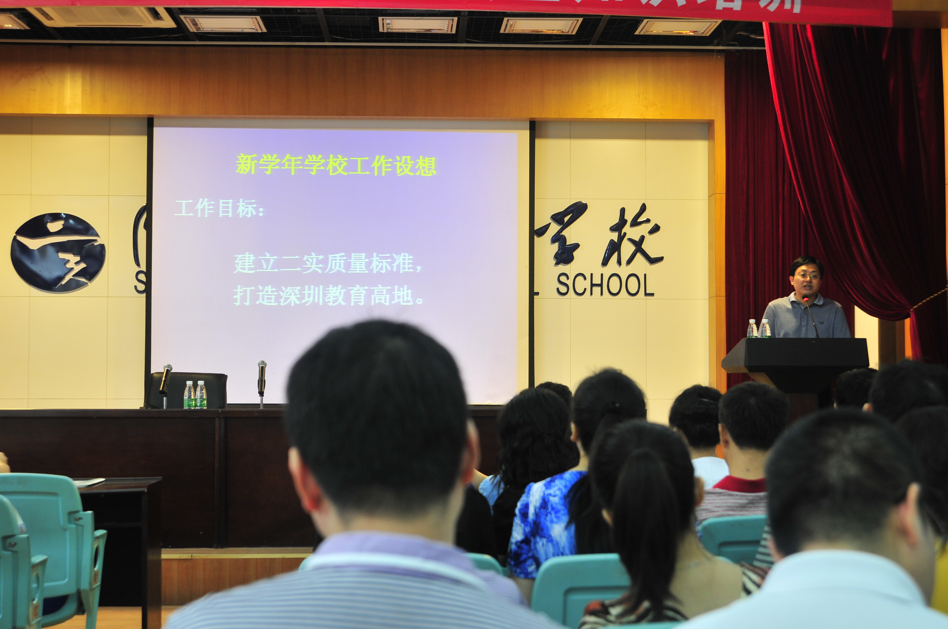 在新学年的工作设想上,赵校长希望全体教职工以“建立二实质量标准,打造深圳教育高地”为目标,以“教育评价探索年”为契机,构建具有弹性与活力的课程与教学实施体系;构建促进学生全面而有个性发展的实践体验体系;构建促进教师专业化发展的研训体系;构建强化岗位竞聘、激活用人的人事管理体系;构建基于网络、智能化的校园保障支持体系。随后,赵校长就新学年十项重点工作及校级领导分工作简要说明。