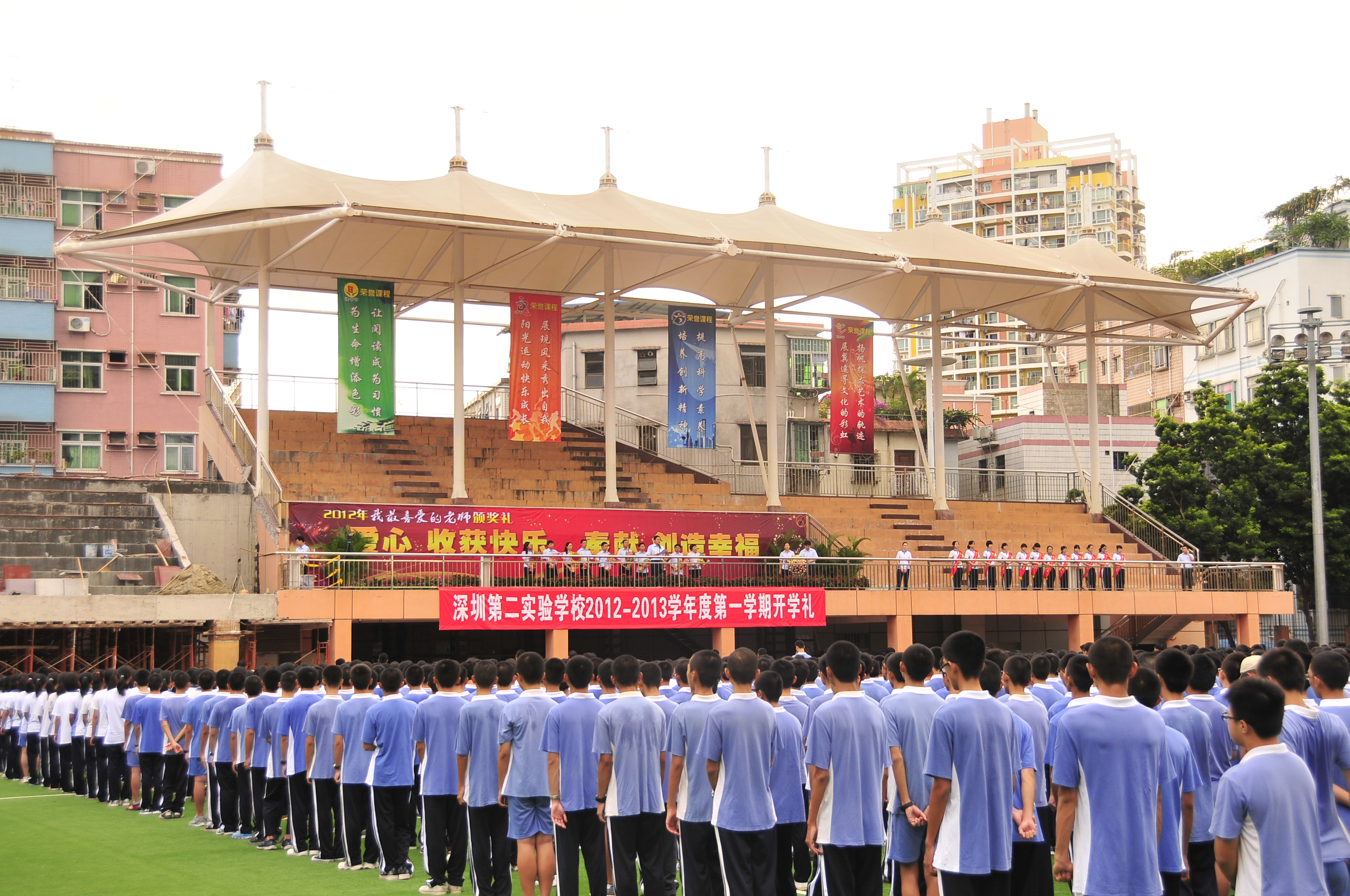 赵立校长在开学典礼上致辞。 赵校长回顾了我校上一学年在中高考成绩、篮球和毽球等传统优势体育项目以及各类科技竞赛中取得的丰硕成果,提出了新学年“建立‘二实’质量标准,打造深圳教育高地”的工作目标,并对不同年级的同学提出了新学期的具体期望。在新的学年里,乘着打造“二实”质量标准的东风,我校全体师生将凝心聚力,共同拼搏,进一步推动我校特色实验品牌的建立。