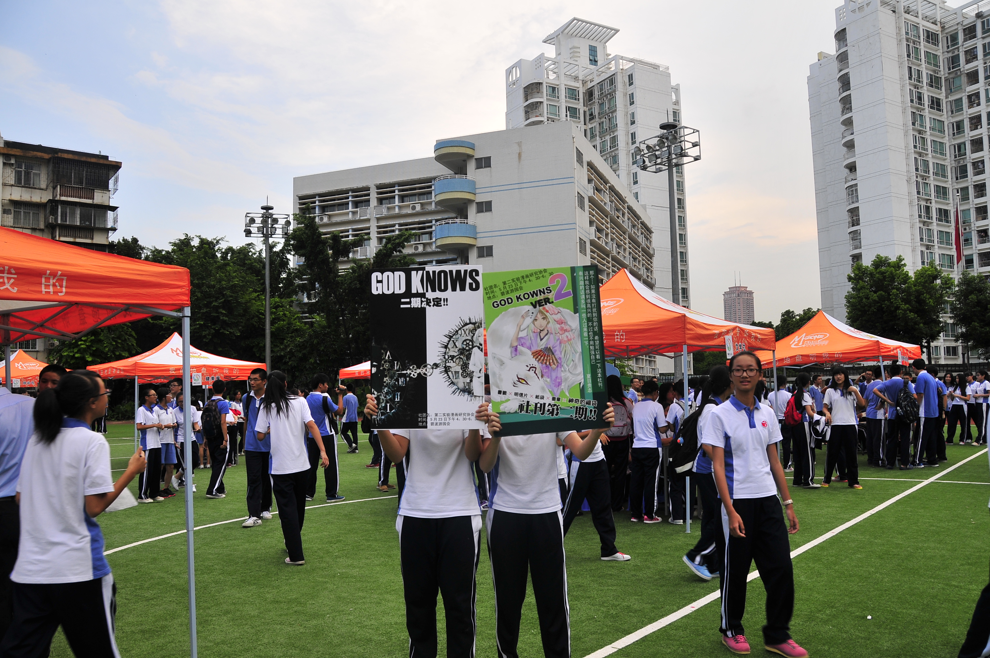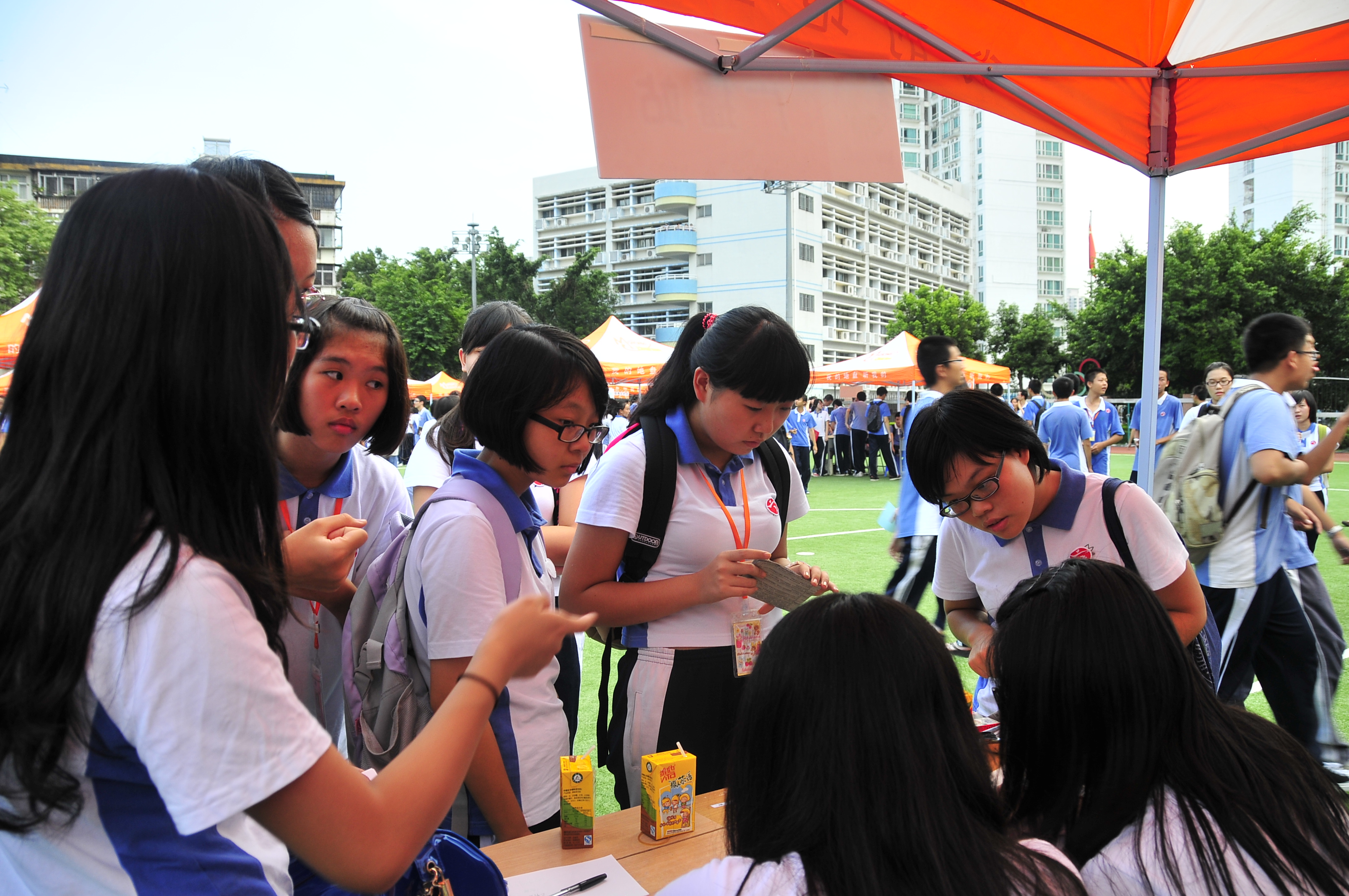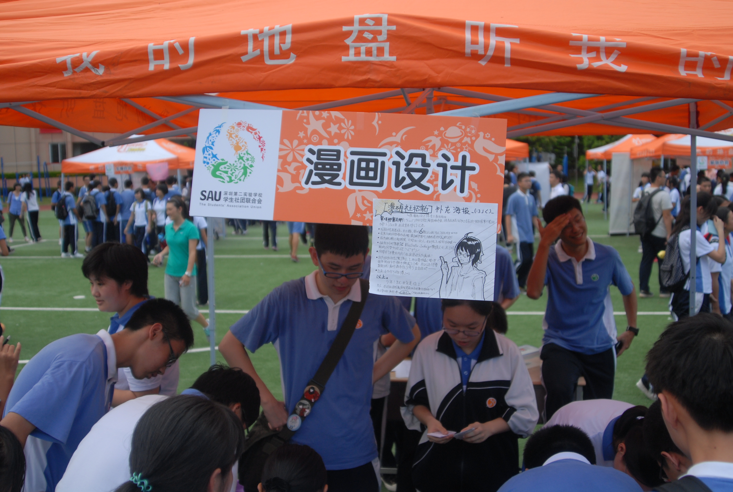 招新大会在高中部体育场举行。高年级的学长打出了精心设计的海报,热情地给学弟学妹介绍本社团的相关情况。新生们踊跃报名,或者在心仪的的社团展位前排起长龙,或者在各个展位前驻足打听,兴奋期待之情,溢于言表。社团的无边魅力,校园的无限活力,在招新大会上再次展现。
