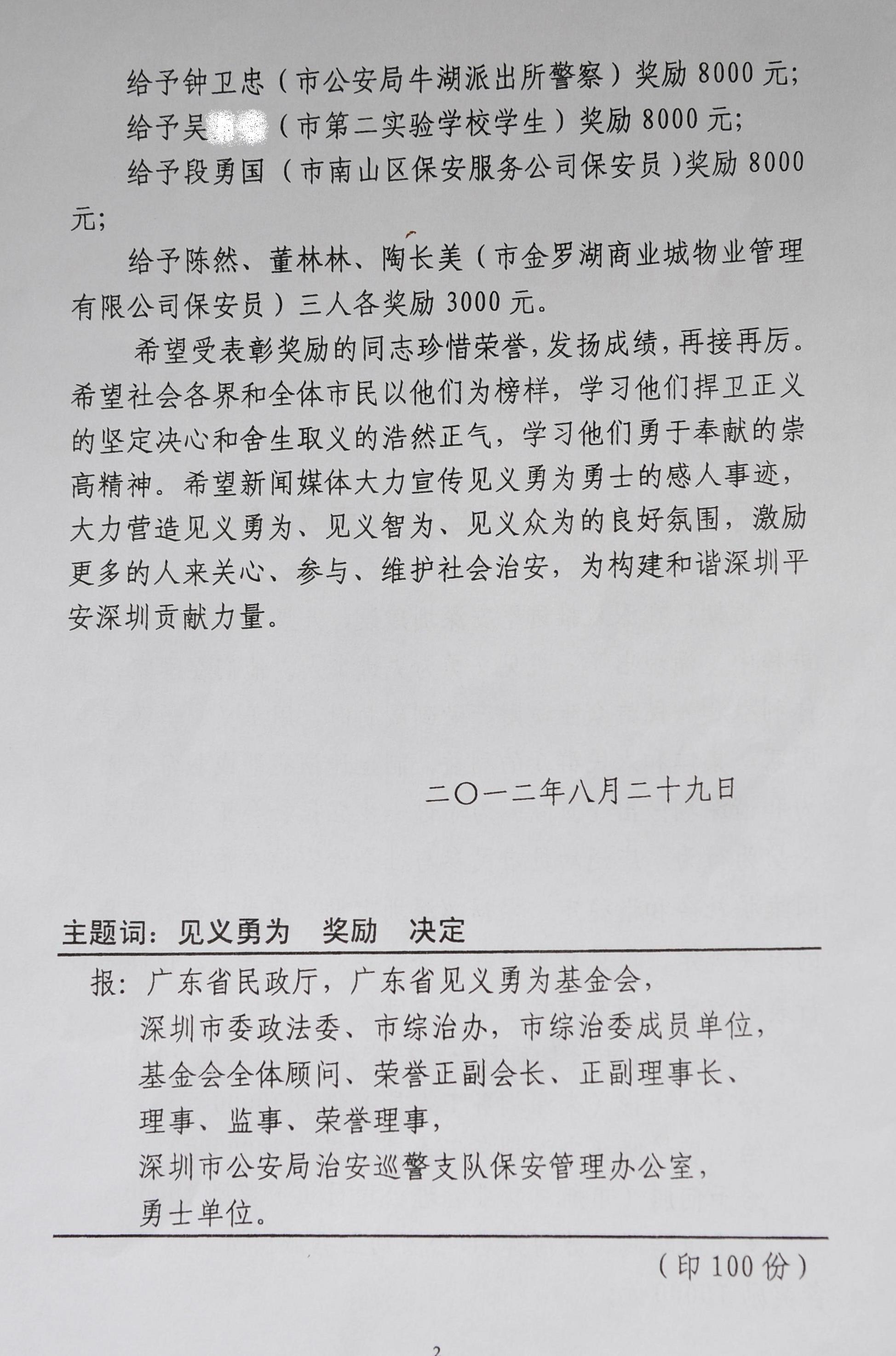 为进一步弘扬社会正气,根据《深圳市见义勇为基金会章程》有关规定,市见义勇为基金会决定对吴同学进行表彰,颁发荣誉证书并给予奖励金8000元。表彰会上,张振方会长对我校及吴同学为平安深圳所做的贡献表示感谢,充分肯定了吴同学应对抢匪的机智表现并寄语吴同学“好好读书、必成大器”,他表示,见义勇为、匡扶正义、除暴安良、无私奉献,是中华民族的传统美德,也是社会主义道德风尚和时代精神的具体体现,但国家、社会和学校要求少年儿童在危急关头重在自救自护,以保护自身安全为先,不提倡年幼学生抓抢匪,要实现和谐深圳这一目标,迫切需要的是营造和谐、安宁、稳定的社会环境,需要激发广大人民群众同违法犯罪分子作斗争的勇气,形成敢于见义勇为良好氛围,让 “见义勇为、见义智为、见义众为”遍及每个角落。