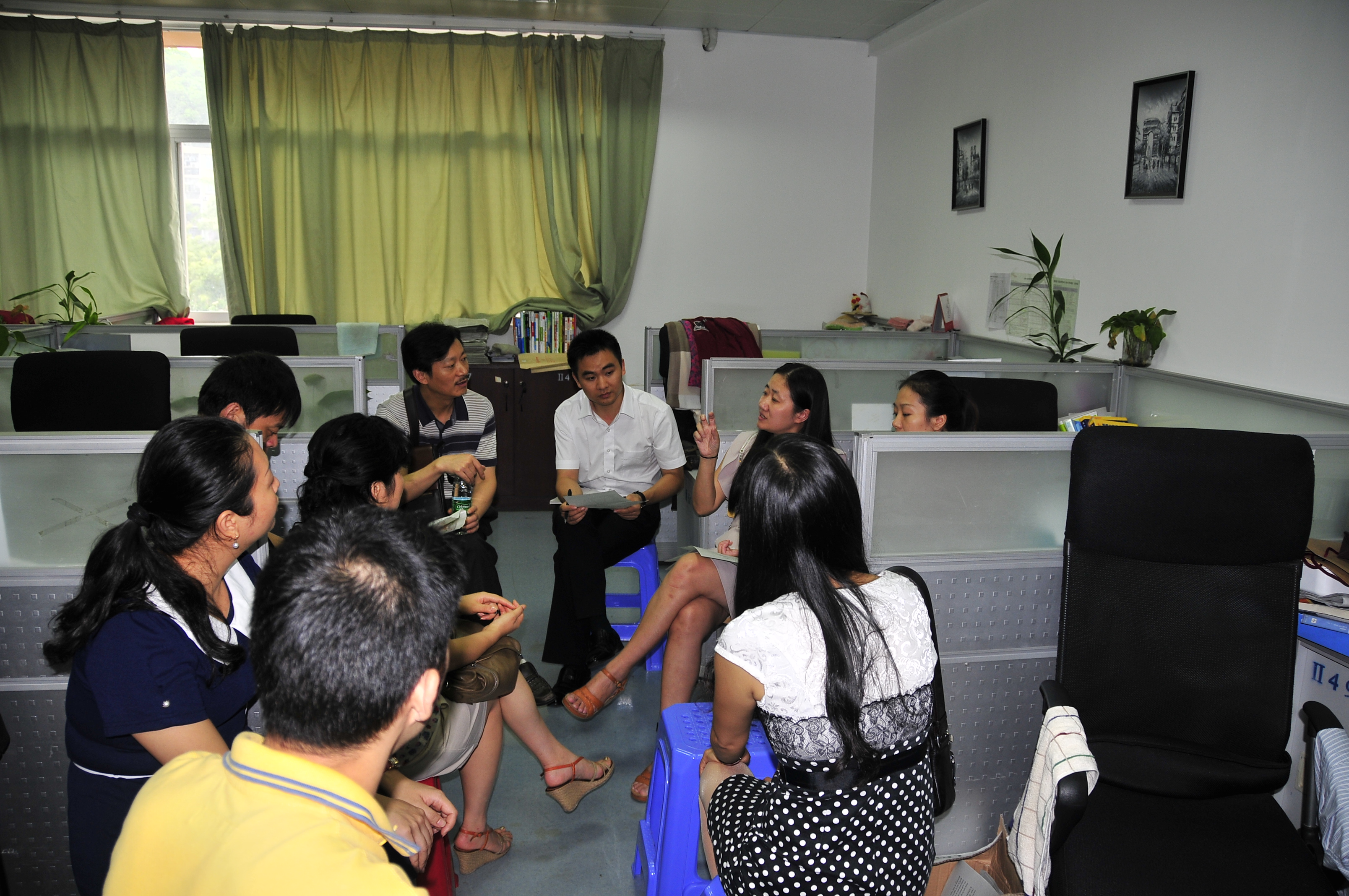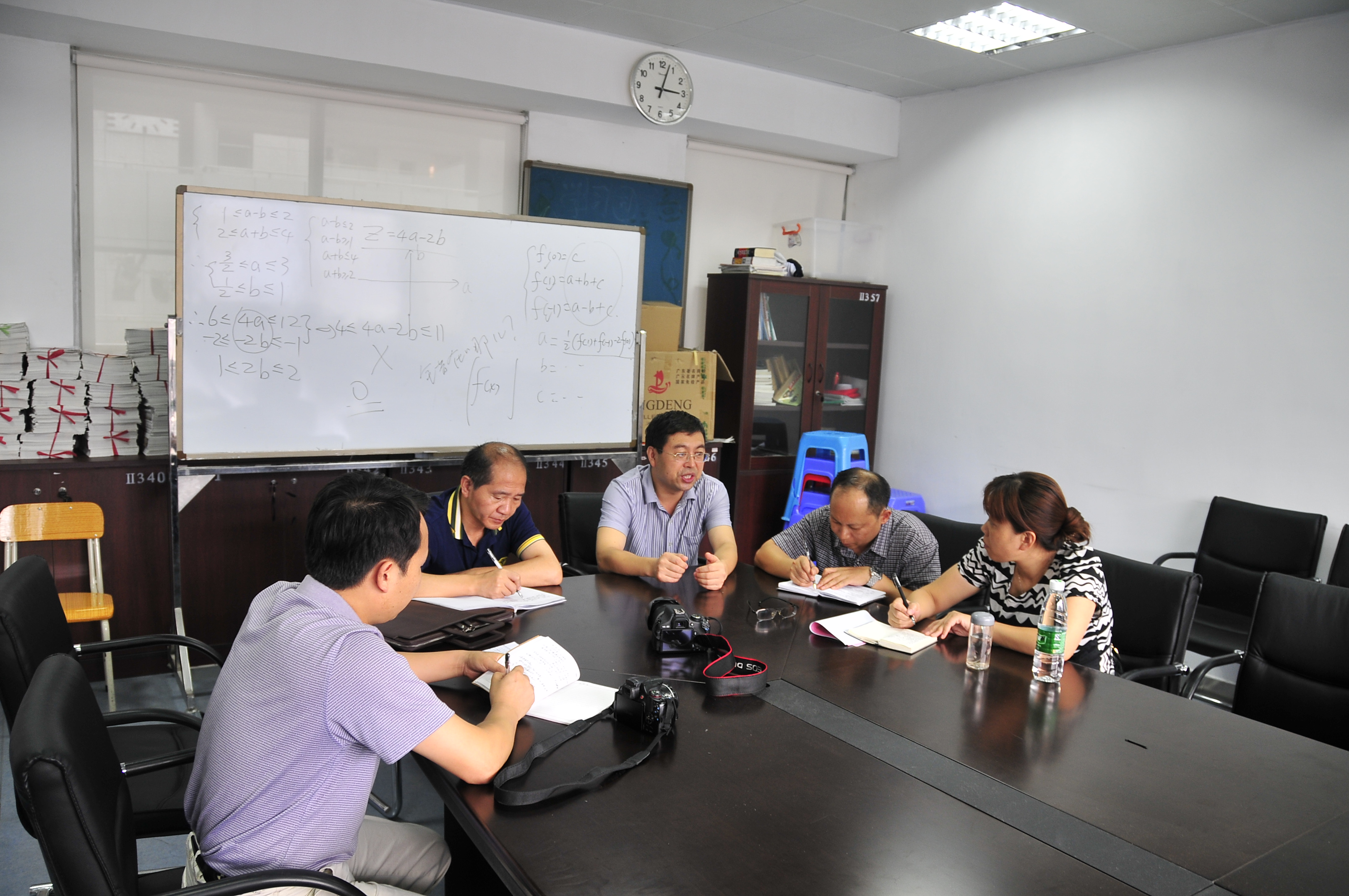 考察团在下午两点开始随机进入我校高三年级各班进行课堂调研,并在课后与相关备课组长就常态教学中的备考思路和方法进行了交流。下午四点,考察团成员与我校教师在综合楼10楼会议室进行了座谈。北碚区教师进修学院黄吉元副院长对我校的热情接待表示真诚的感谢,并就此行所关注的学科常态教学中如何保持高效备考、年级组和备课组怎样联动管理以及学校如何充分发挥高考备考中的管理职能等问题进行提问。郑联采副校长介绍了我校在确保集体备课的实效性、校本练习的针对性和教学质量跟踪的科学性等方面的做法,高三年级陶继智主任就来宾颇感兴趣的我校教学质量分析系统问题从目标分解、三线分析和动态跟踪机制等方面作了详细的阐述。在座谈中,双方还就一些共同关注的问题进行了探讨。座谈会后,考察团在陆林主任的陪同下参观了我校校园。