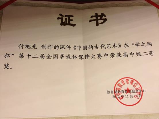 由教育部教育管理信息中心组织的“第十二届全国多媒体课件大赛”于11月17日到19日在北京举行。大赛经教育部权威专家的初审、复审、现场演示、专家提问等环节,我校历史与社会付旭光老师制作的课件《中国的古代艺术》荣获高中组全国二等奖。