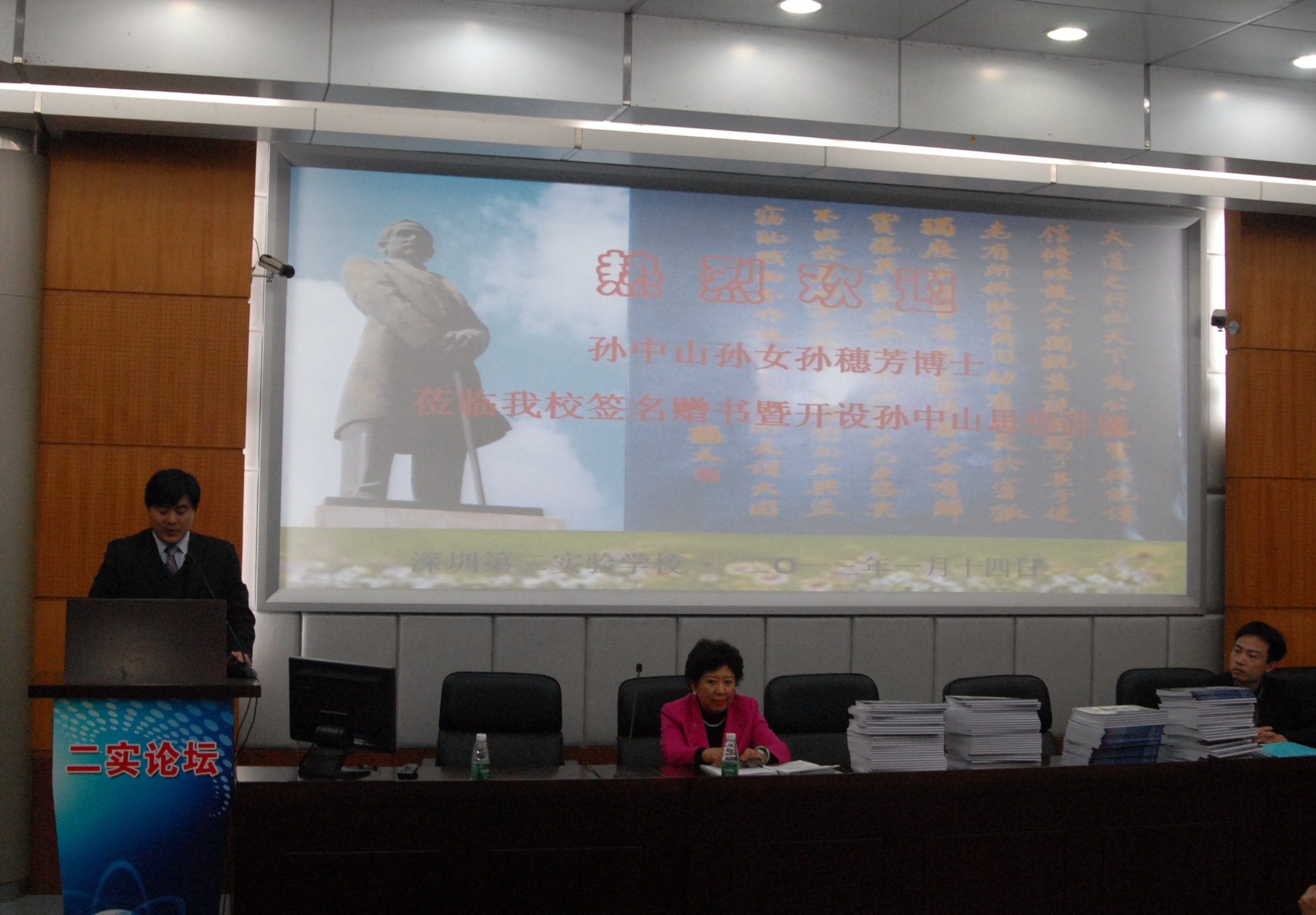 孙穗芳博士,现任孙中山和平教育基金会主席、夏威夷中国妇女慈善会会长。77岁高龄的她一生都在身体力行地宣扬中山先生的思想,在世界各地所作演讲已达1000多场,近年来更是不惜变卖房产、斥资千万向全国各地捐赠了100多座中山先生铜像。近日孙穗芳博士来深圳筹备成立孙中山研究会,百忙之中莅临我校为同学们开设讲座。