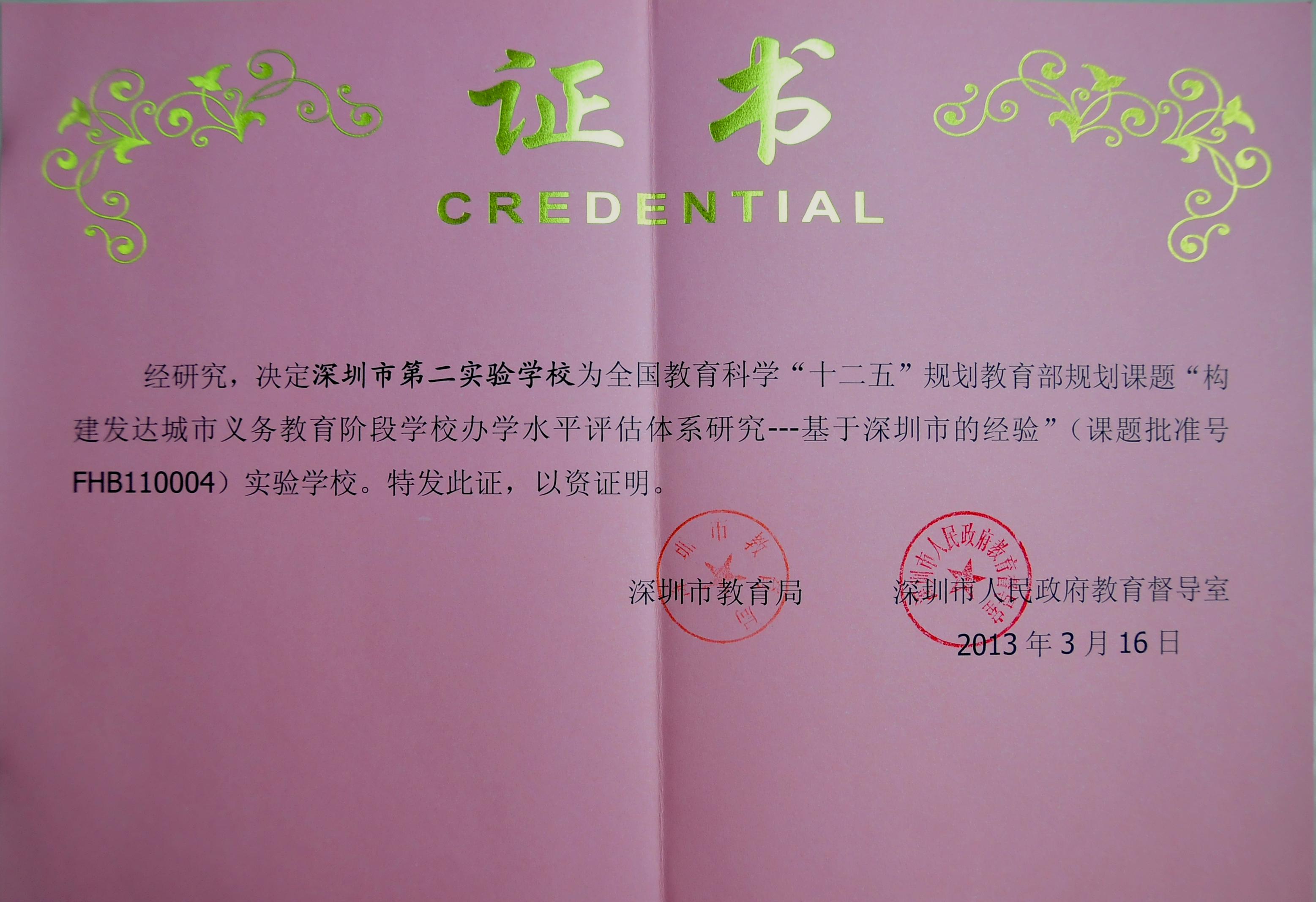 根据市教育局2013[109]号文件的通知,经市教育局、市人民政府教育督导室研究决定,我校成为全国教育科学“十二五”规划教育部规划课题实验学校,课题名称为“构建发达城市义务教育阶段学校办学水平评估体系研究——基于深圳市的经验”,课题批准号为FHB110004。