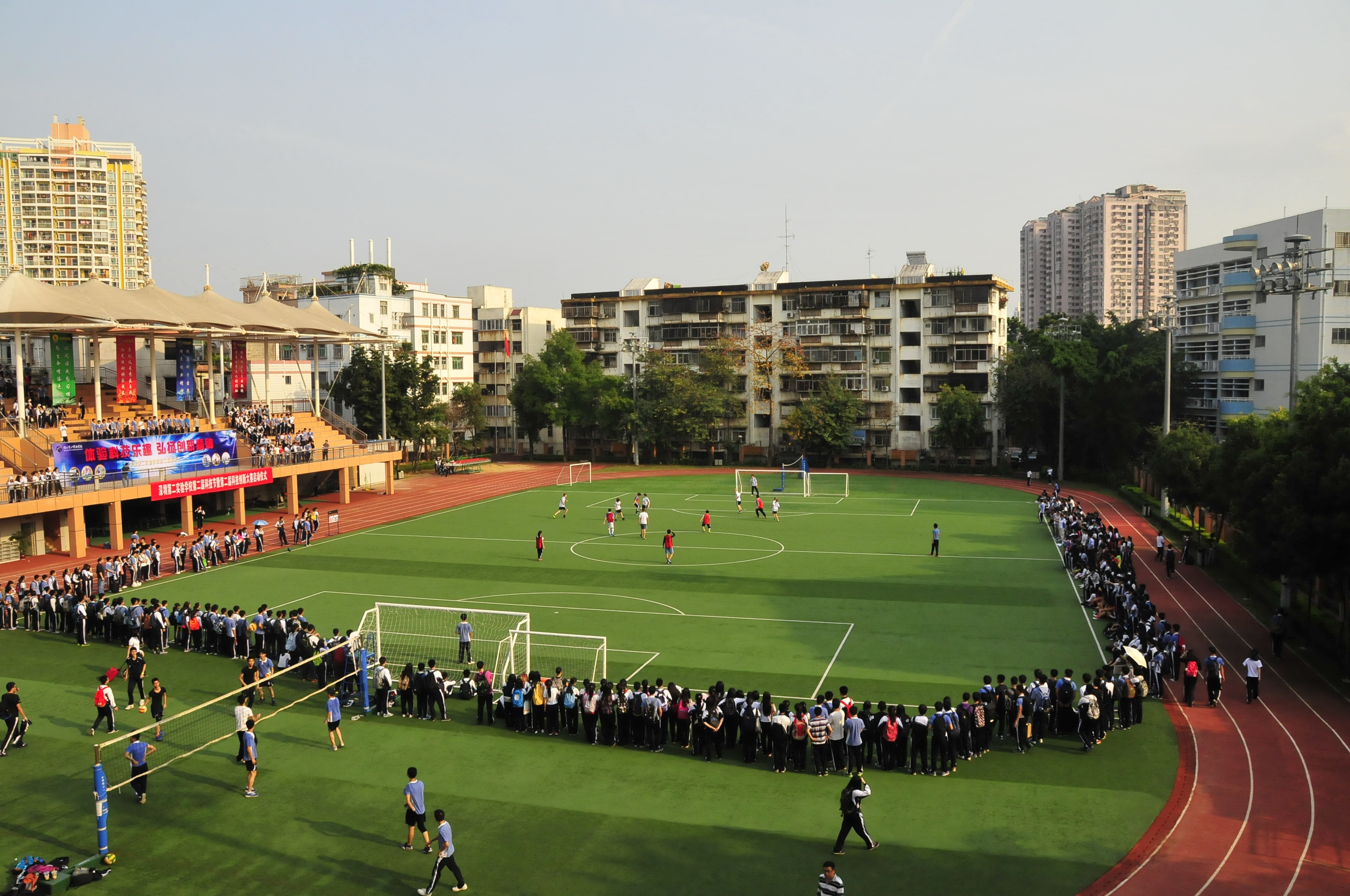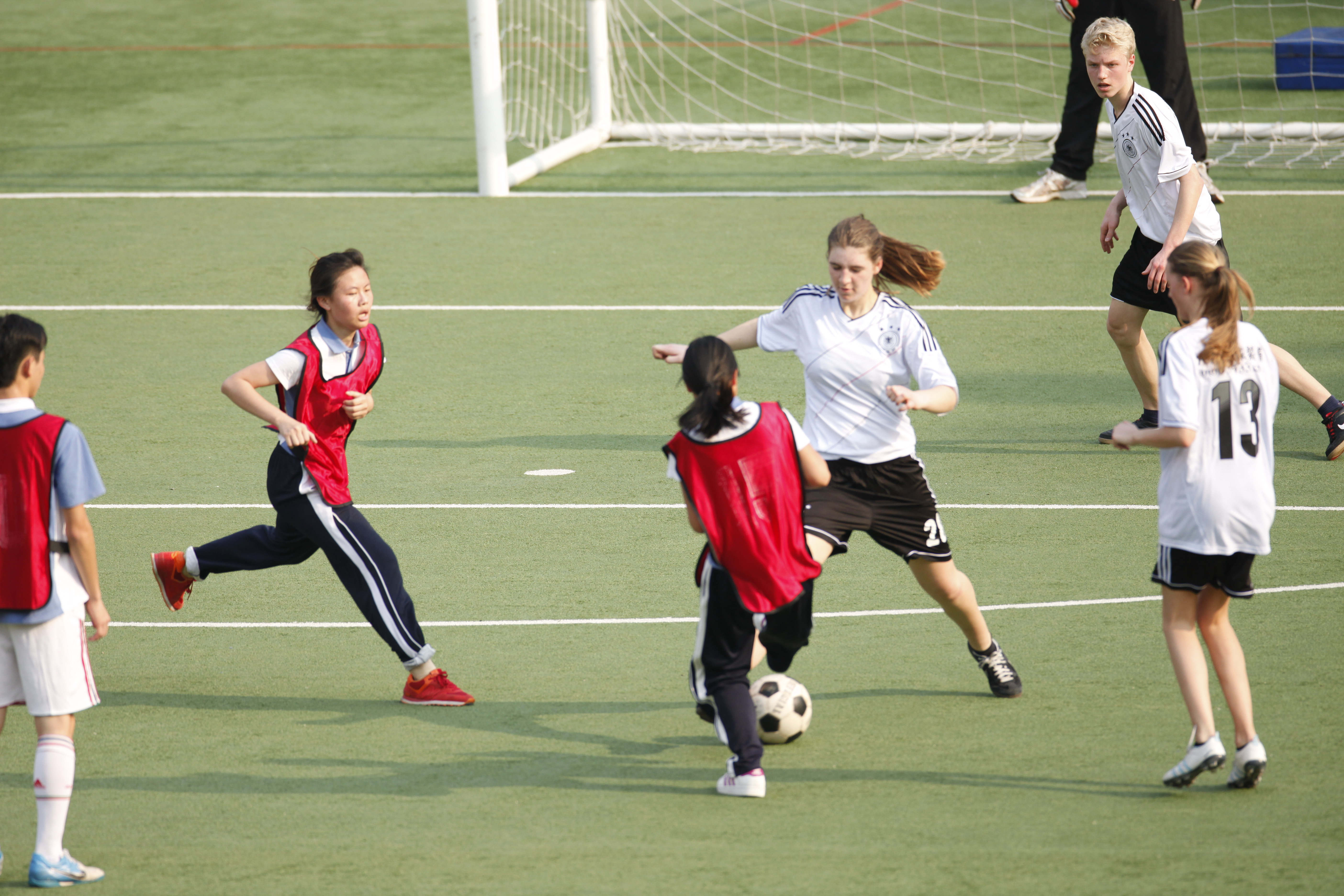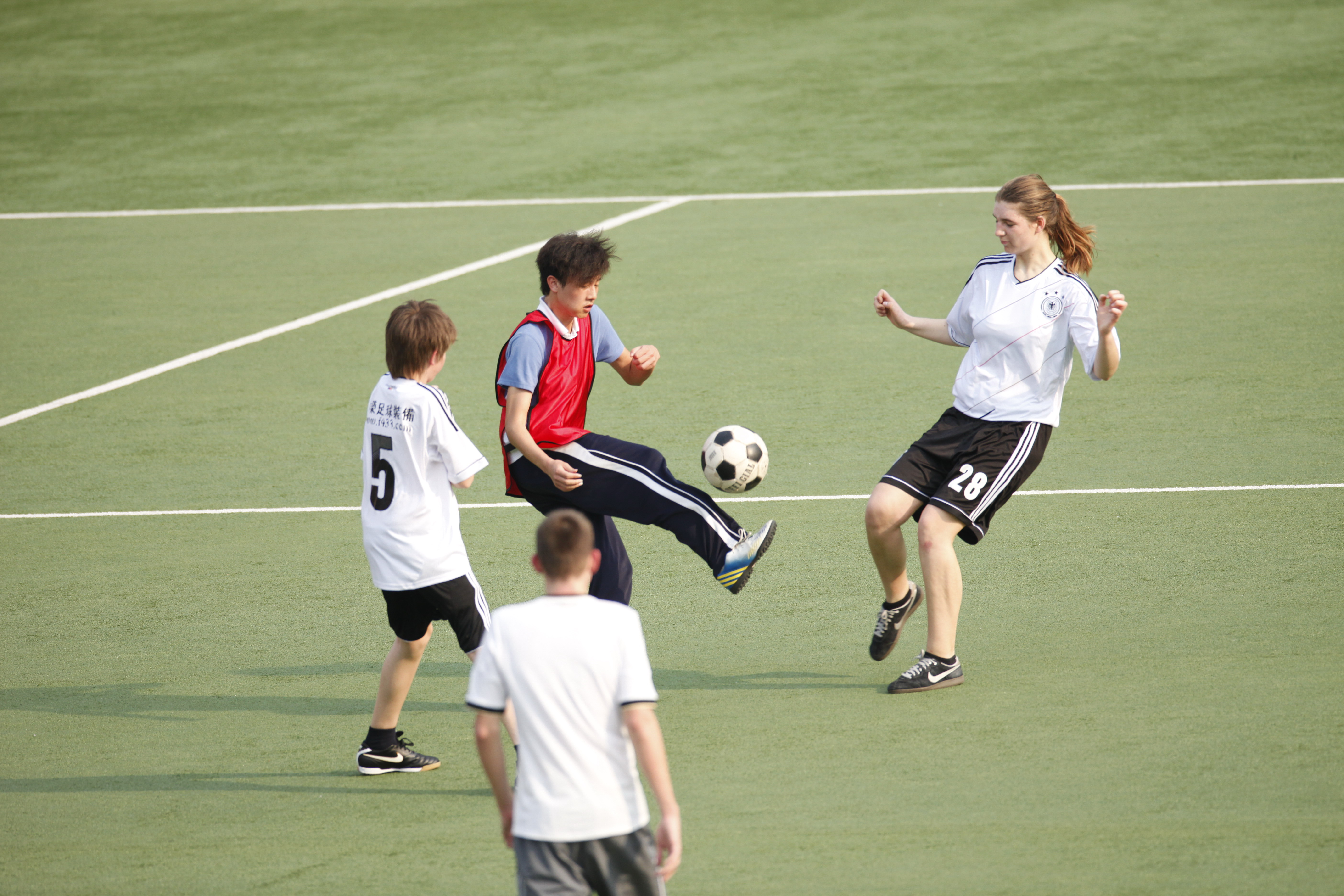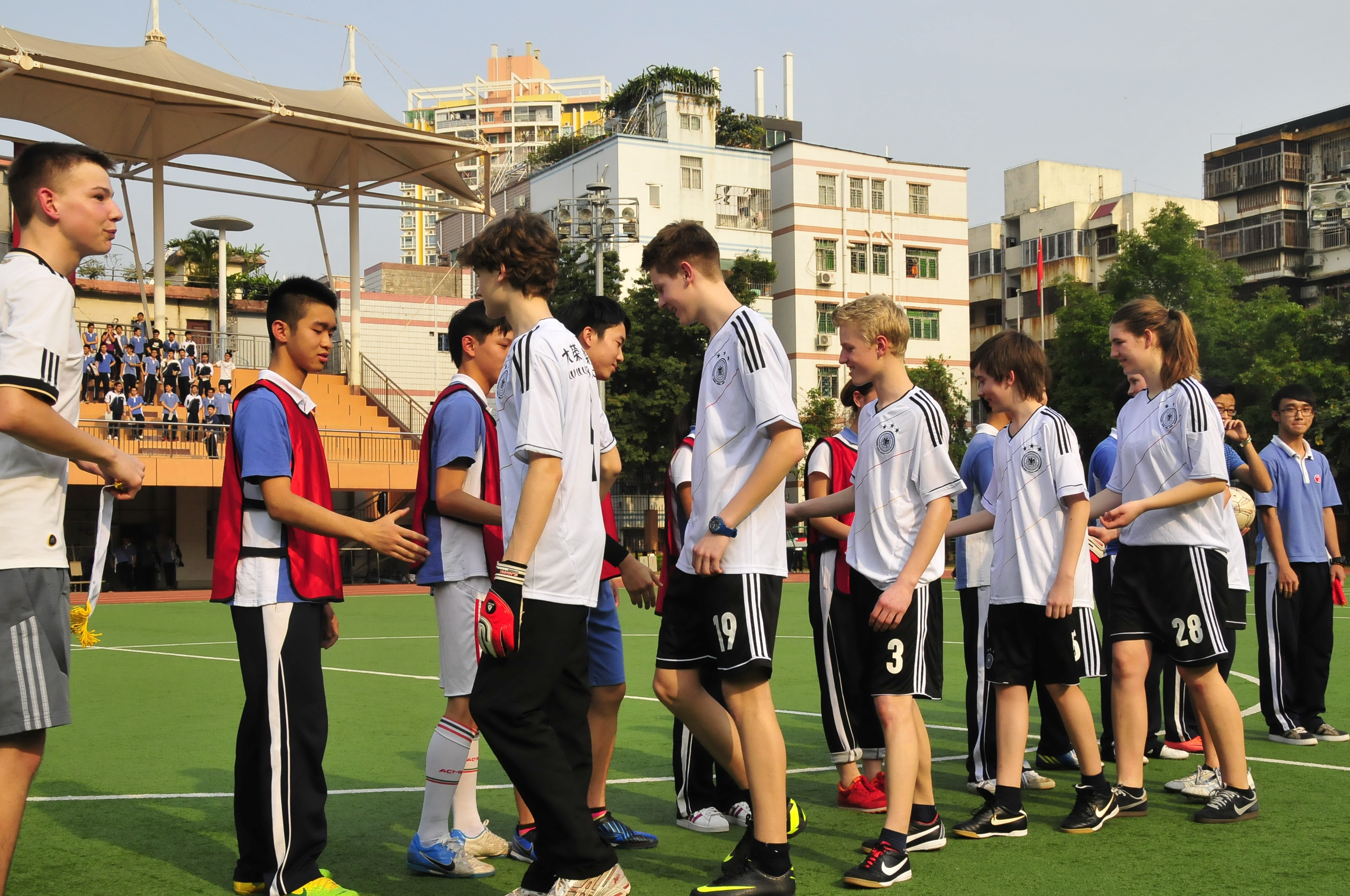 3月22日下午四点十五分,我校高中部学生与德国亚琛安妮法兰克文理中学学生的足球友谊赛在高中部足球场吹响哨音。