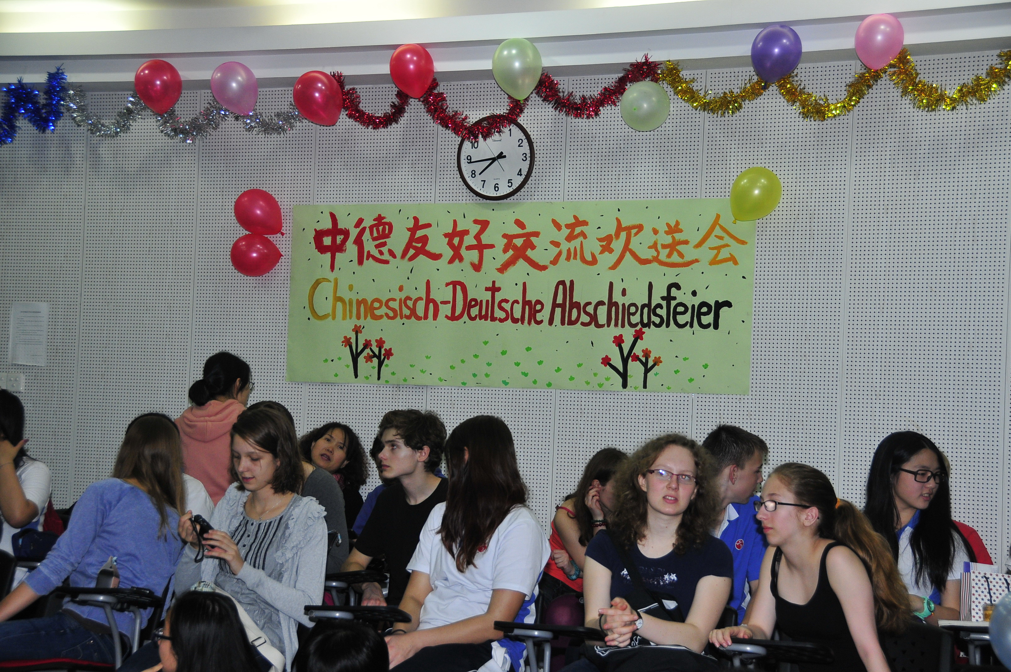 3月20—28日,德国亚琛安妮法兰克文理中学师生一行18人对我校进行了为期一周的交流访问。我校为来访的德国朋友们安排了丰富多彩的交流活动。在德国来访团即将离去的前夕,3月27晚,在综合楼音乐室,我校师生为德国朋友们组织了一场热情而欢乐的送别晚会——“中德友好交流欢送会”。