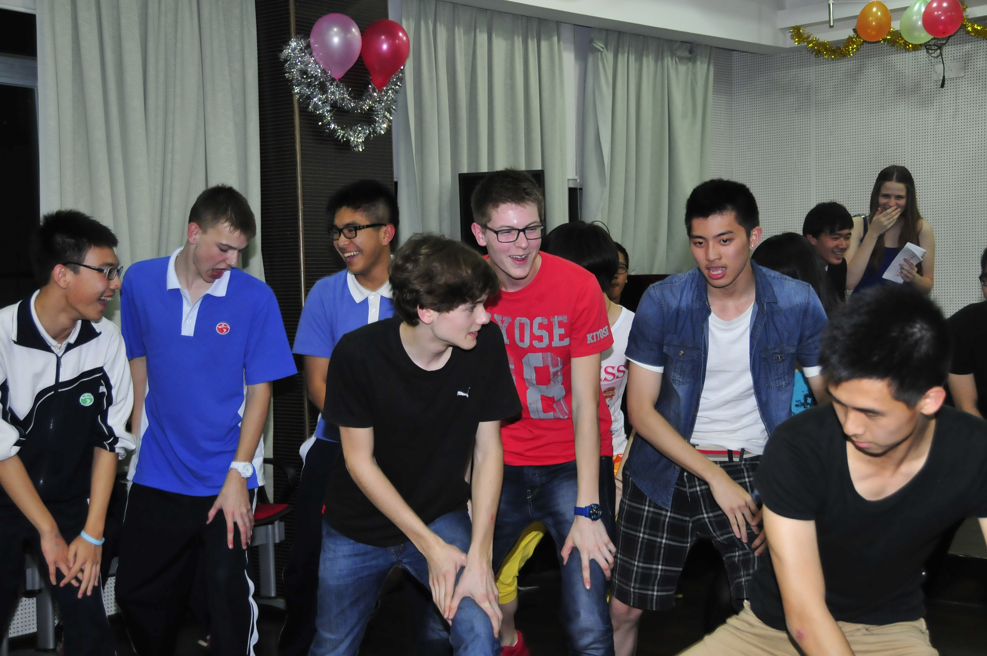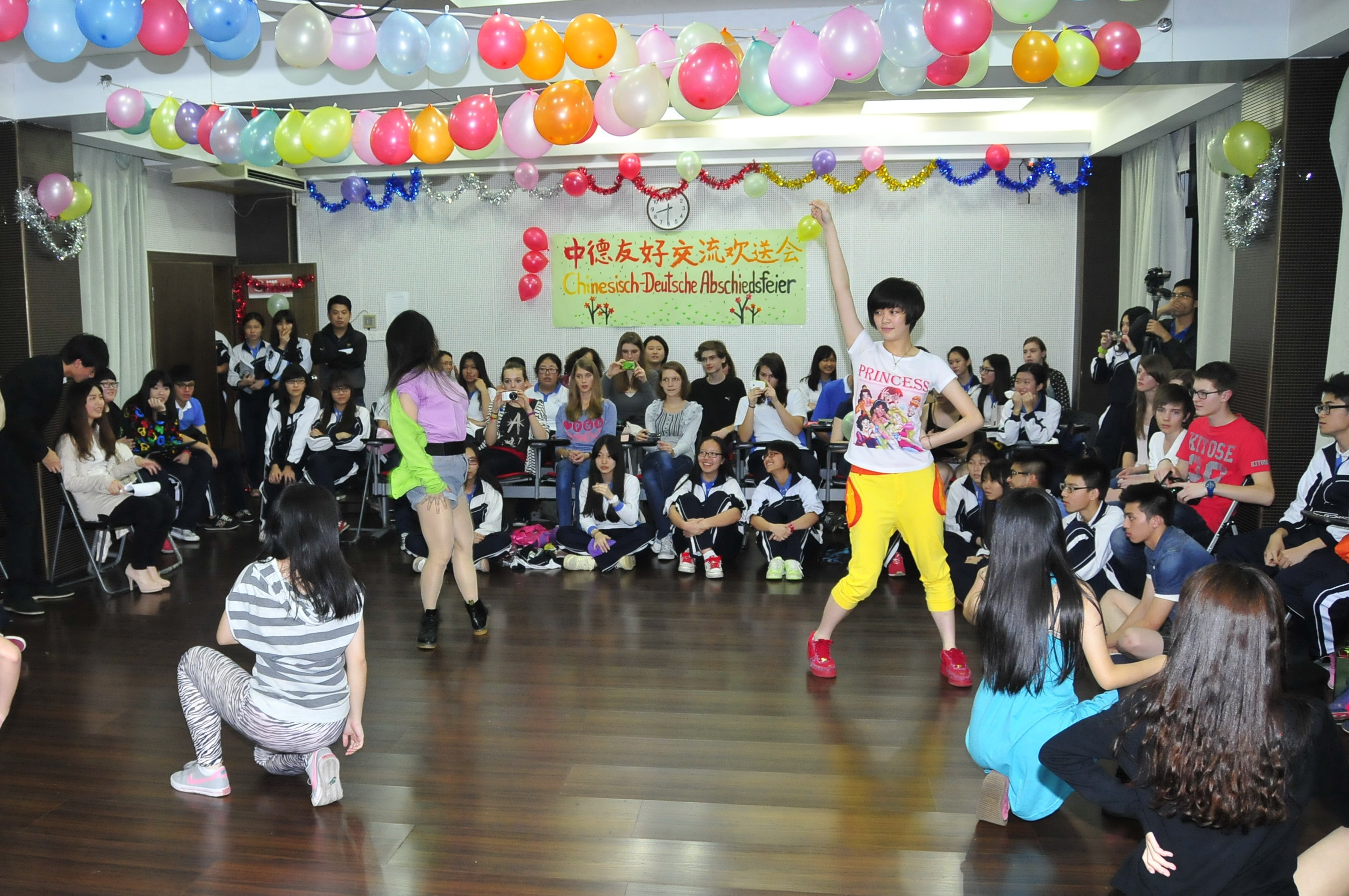 接下来主持人带动下大家玩起了数数接力、爱的抱抱等趣味游戏,中德两国师生迅速打成一片,晚会现场成了欢乐的海洋。在游戏间隙,高二(18)班学生为大家送上了精心准备的英文歌曲《Need you now》,以及英文诗歌朗诵《Singing goodbye to Cambridge again》,祝福友谊地久天长。在劲爆的音乐声中,TOT街舞社和德国学生一起跳起了风靡全球的骑马舞,将晚会气氛推向高潮。