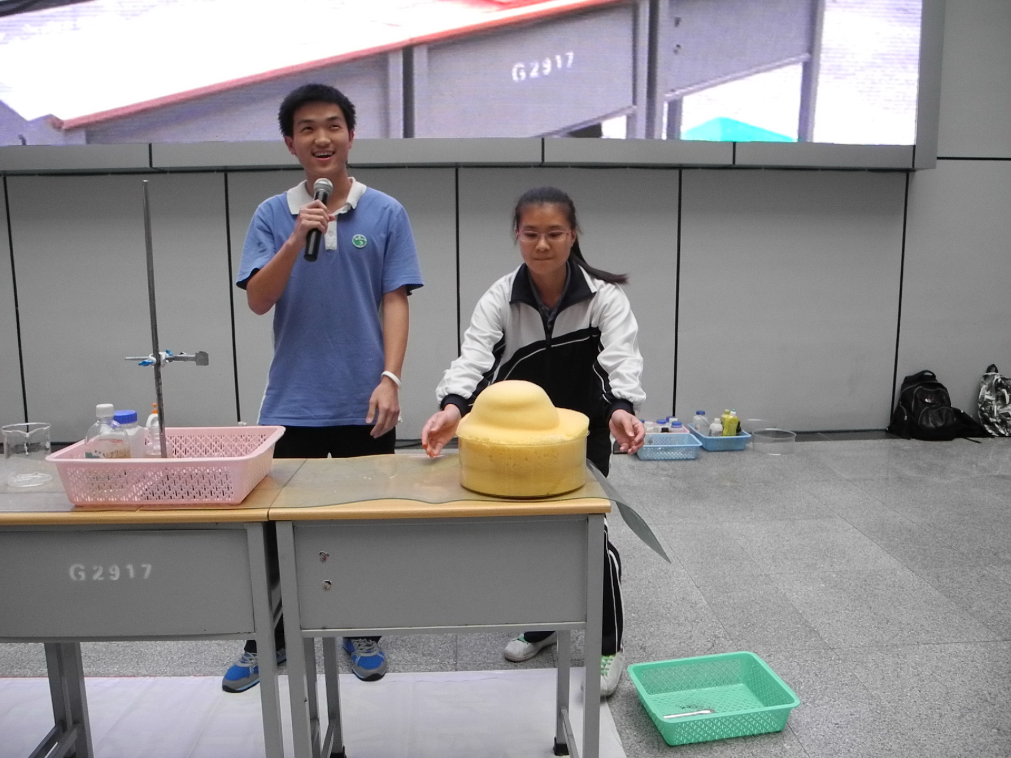 ◆化学魔术汇演 3月27 日下午,同学们期待已久的化学魔术表演在教学一楼大厅闪亮登场。高一和高二的十几组同学给大家带了几十个异彩纷呈的魔术实验,效果极其轰动!例如“大象的鼻子”、“彩色冰激淋”、“法老之响”、“点不着的抹布”、“火山爆发”、“水下星火”、“火山爆发”等等,吸引大量同学围观和参与。通过大厅的电子屏幕实况转播,六层的教学大厅走廊上都挤满了津津有味欣赏的同学。当最后一组同学坚持完成了耗时长但非常有意义的七色焰火实验,他们执着、专业的态度获得了热烈的掌声。此次化学魔术表演高一和高二的学生都做了若干次预演、充分的准备,化学科组老师们也多次到场指导,保证大家的安全,加上电教部老师的积极配合,化学魔术大会顺利结束。