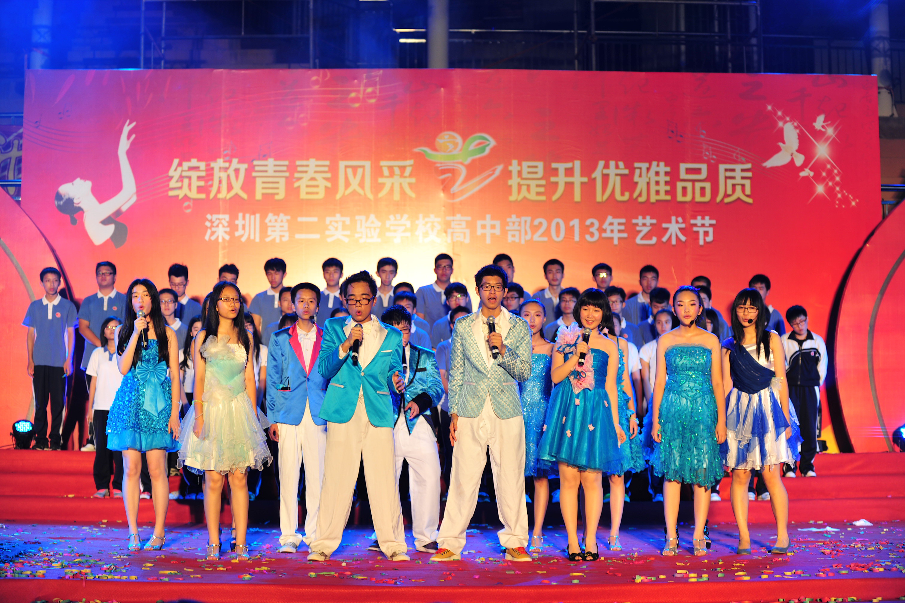 在学生处、艺体中心、信息中心、音乐组、美术组、语文组等部门和科组的精心策划和辛勤努力下,从各艺术节专场比赛中选拔出十四个精品节目参加本次文艺汇演。所有节目均为集体演出,由社团节目和班级节目两大部分组成。