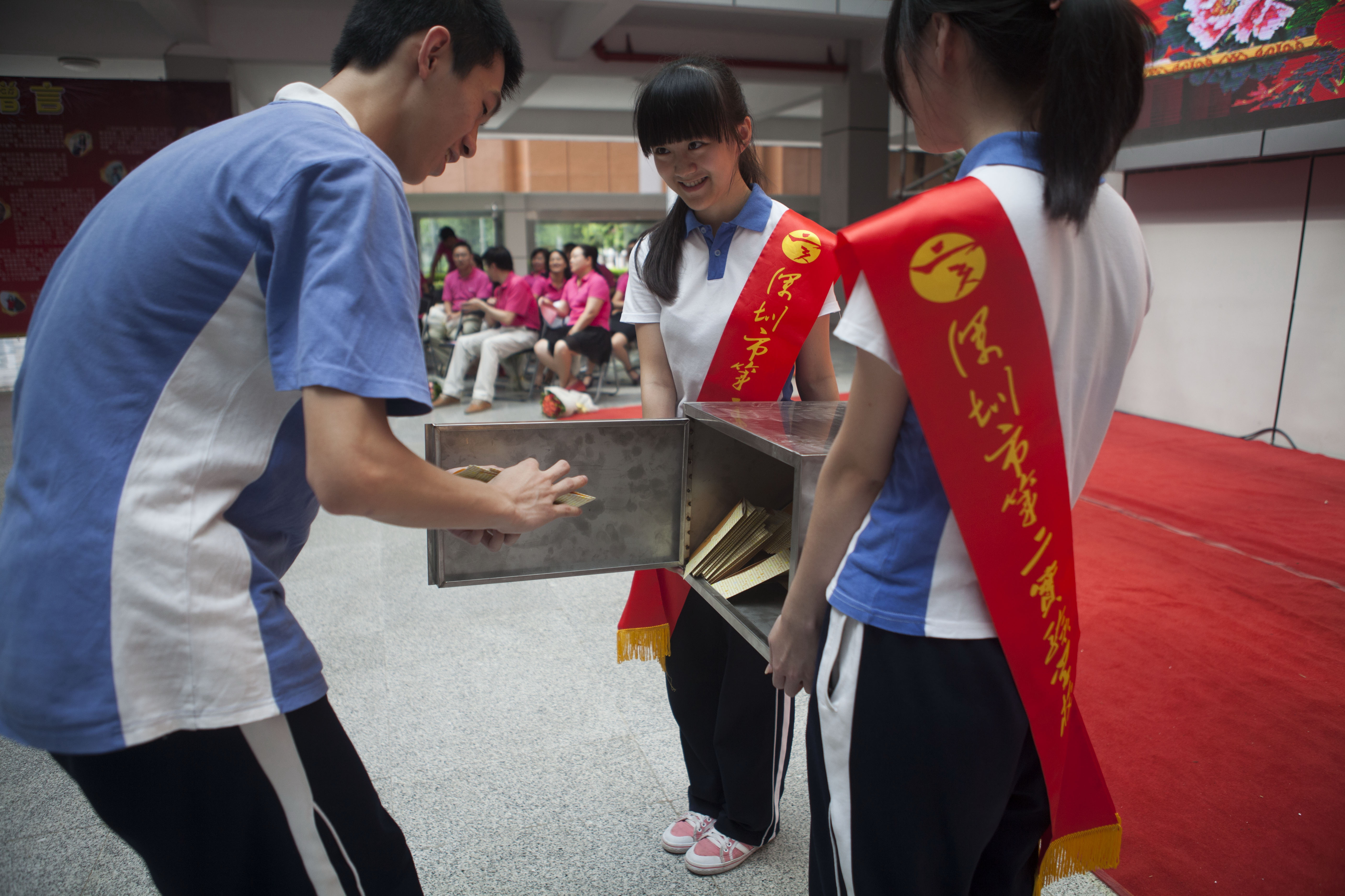 高三的600多位毕业生,拿着小板凳,在教学楼中间排排坐下。一段回顾学生和老师三年生活的PPT,让同学们重新开启了记忆的闸门。PPT先播放了同学们的照片,过去的时光勾起了同学们心底那尚未远去的回忆,每逢播放至某个班的事情时,那个班便响起一片欢闹和叫好。“佛说:前生500次的回眸才换得今生的擦肩而过,我们能做你们的老师是莫大的缘分。”高三年级级主任陶继智说,“这三年来你们个子也长高了,知识也增长了,还有更广阔的天地等着你们去闯。”他说到这里,同学们无不动容。