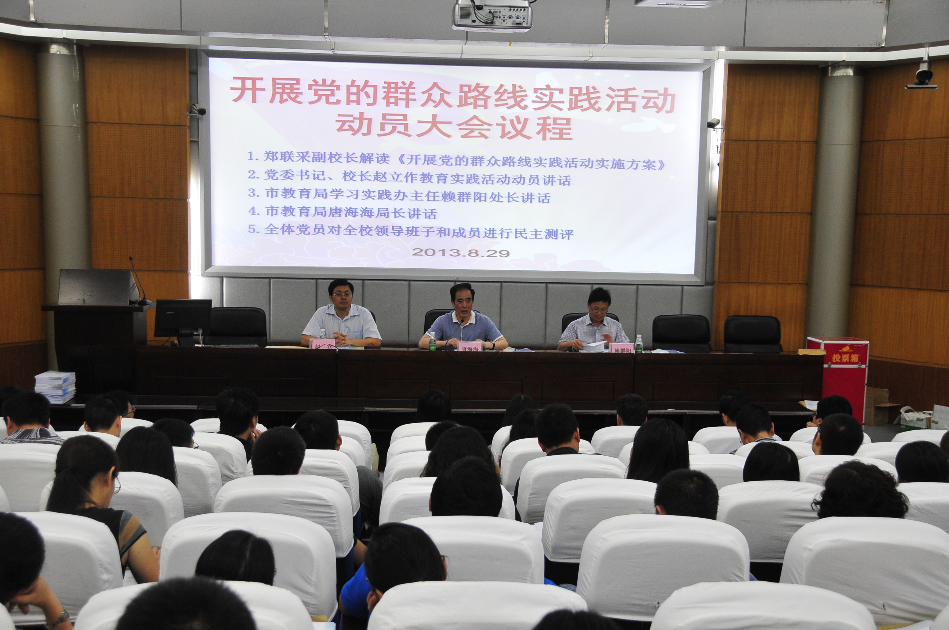 8月29日下午,我校“开展党的群众路线教育实践活动”动员大会在高中部报告厅隆重召开。学校全体党员参加会议,市教育局唐海海副局长、实践办主任赖群阳处长和督导一组卢艳红、吴雪芹两位老师莅临大会指导工作。