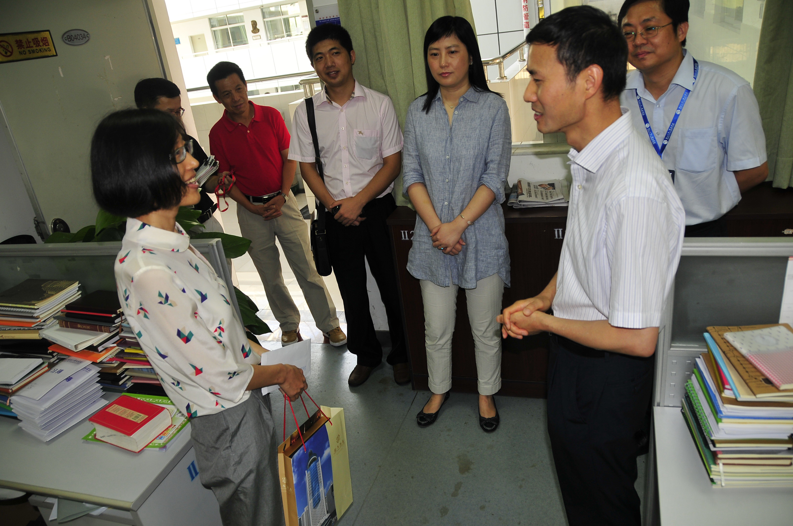 范坤副局长等人首先到教师办公室看望一线教师。当他们来到四楼高一年级(2)办公室的时候,老师们暂时停下了手中忙碌的工作,起立鼓掌欢迎。范局长走到刚刚下课的语文教师王艳喆老师身边,亲切询问了王老师最近的工作、生活、治疗的情况,细致到王老师在哪里治病、用什么药、最近休息得怎么样,并代表市教育局送上了节日礼品和慰问金。范局长对王老师带病坚持工作的精神表示高度的赞赏,对二实老师的敬业精神表示由衷的肯定。