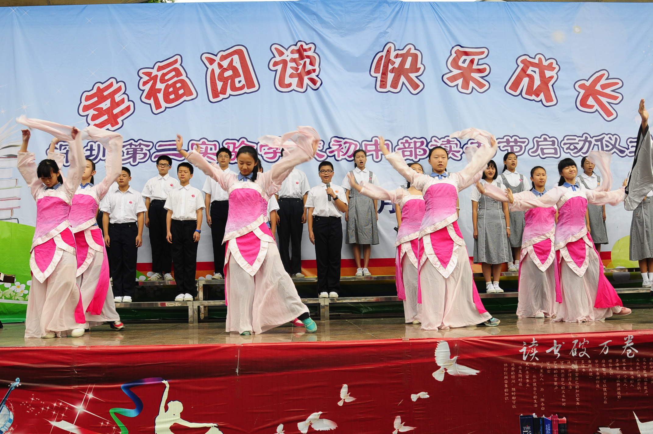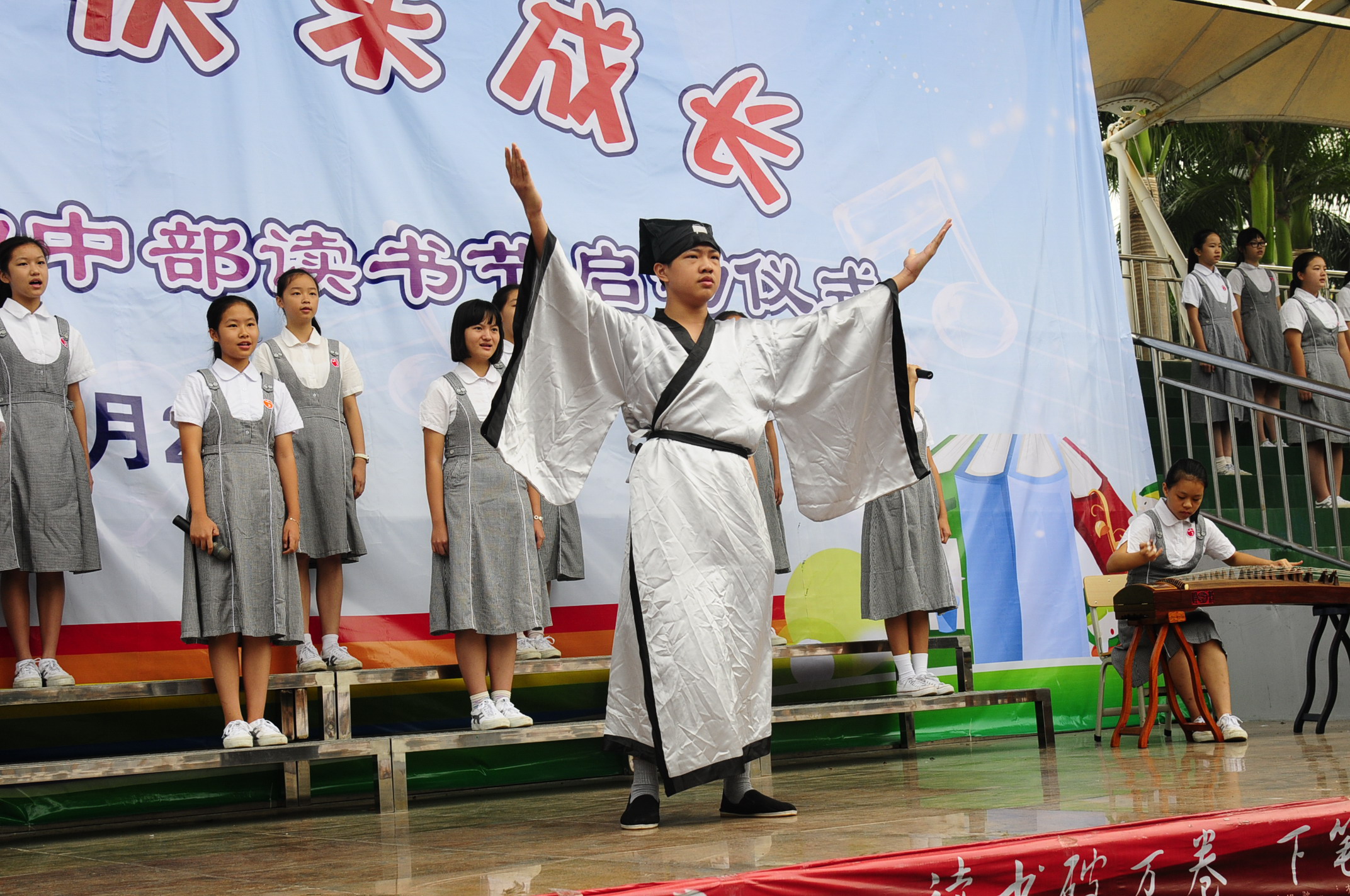 郑联采副校长在开幕式致辞中指出,举办读书节对于构建书香校园,形成内涵丰富、特色鲜明的校园文化及营造良好的读书氛围具有积极的促进作用,强调“一个民族的阅读史,就是这个民族的成长与发展史”,希望全校师生在本届读书节活动中积极参与活动,享受读书快乐,感悟读书方法,成就精彩人生。开幕式上,高中部传媒艺术班的同学们充满激情地朗诵了《祖国——母语》,以丰富的感染力激发了同学们对祖国和母语的热爱;初中部的同学们表演了大型诗朗诵《中秋月思》,以音乐、舞蹈、独白、齐诵等多种形式表达了中秋之夜人们的无限遐思。