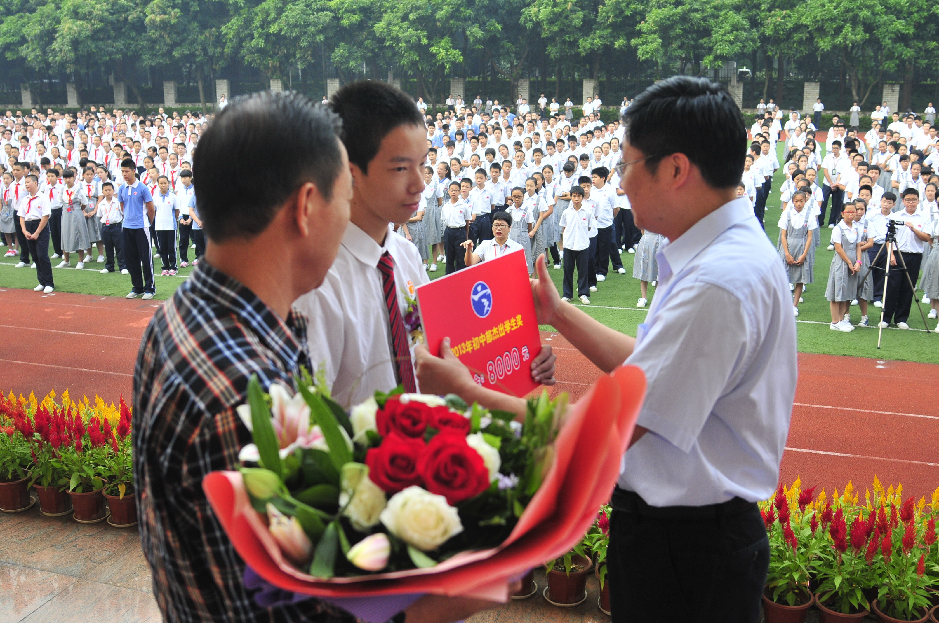 庄严的升旗仪式过后,学生处吴凡主任宣读了2013年杰出学生表彰决定,温佩松、王玎、张倩、李键玮等18名同学被评为我校2013年“杰出学生”。在主持人李雪亮老师的介绍声中,获奖学生与家长在阵阵掌声中逐一走上前台。赵立校长与获奖学生及其家长亲切握手,亲自为获奖学生颁发获奖证书和奖金,并为家长献上芬芳的鲜花。