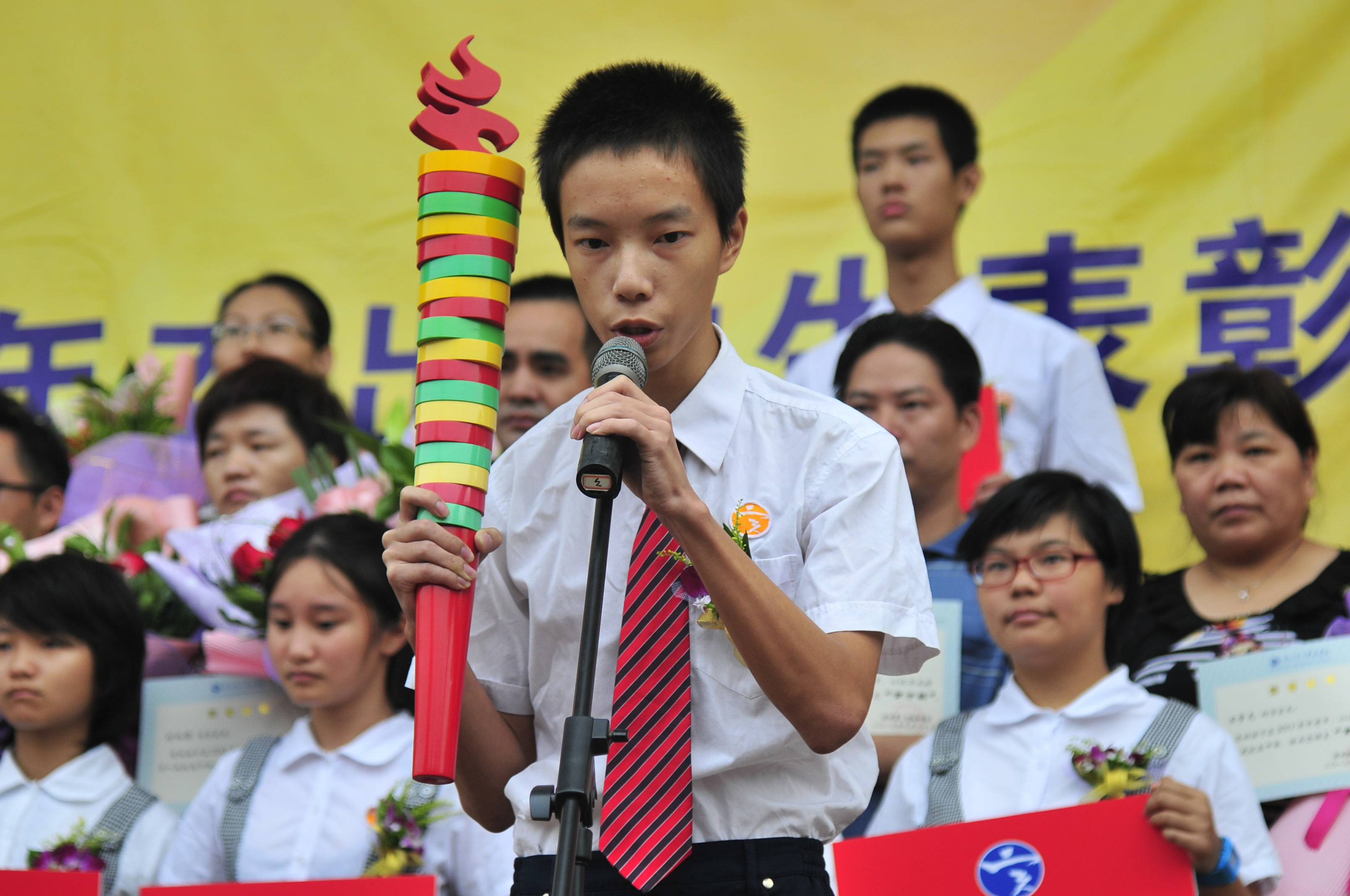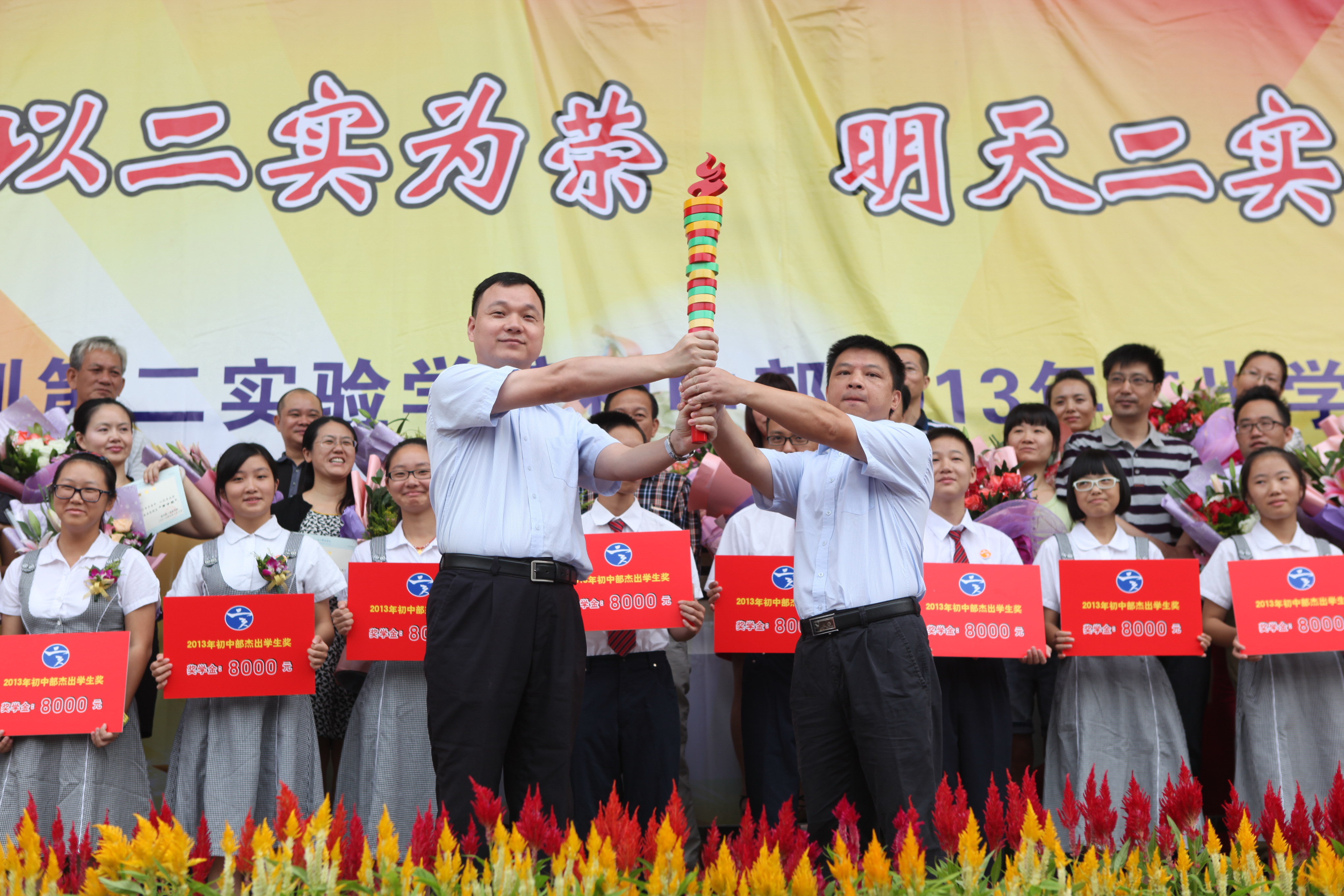 颁奖完毕,接着举行火炬传送仪式。象征我校师生勤劳、智慧、兢兢业业、生生不息的火炬,由2013届初三年级杨爱军主任传递给现高一年级李刚副主任,再传递到杰出学生代表温佩松手中。温佩松同学发表了获奖感言,将火炬传给了初三年级学生代表钟希君。钟希君同学代表初中部全体学子发表二实学子宣言,表示定将铭记师兄的嘱托,不辜负学校的期望,刻苦学习,奋勇拼搏,继续发扬和传承二实学子“成长为先,追求卓越” 的优秀进取求学精神,在二实校园实现青春的价值。