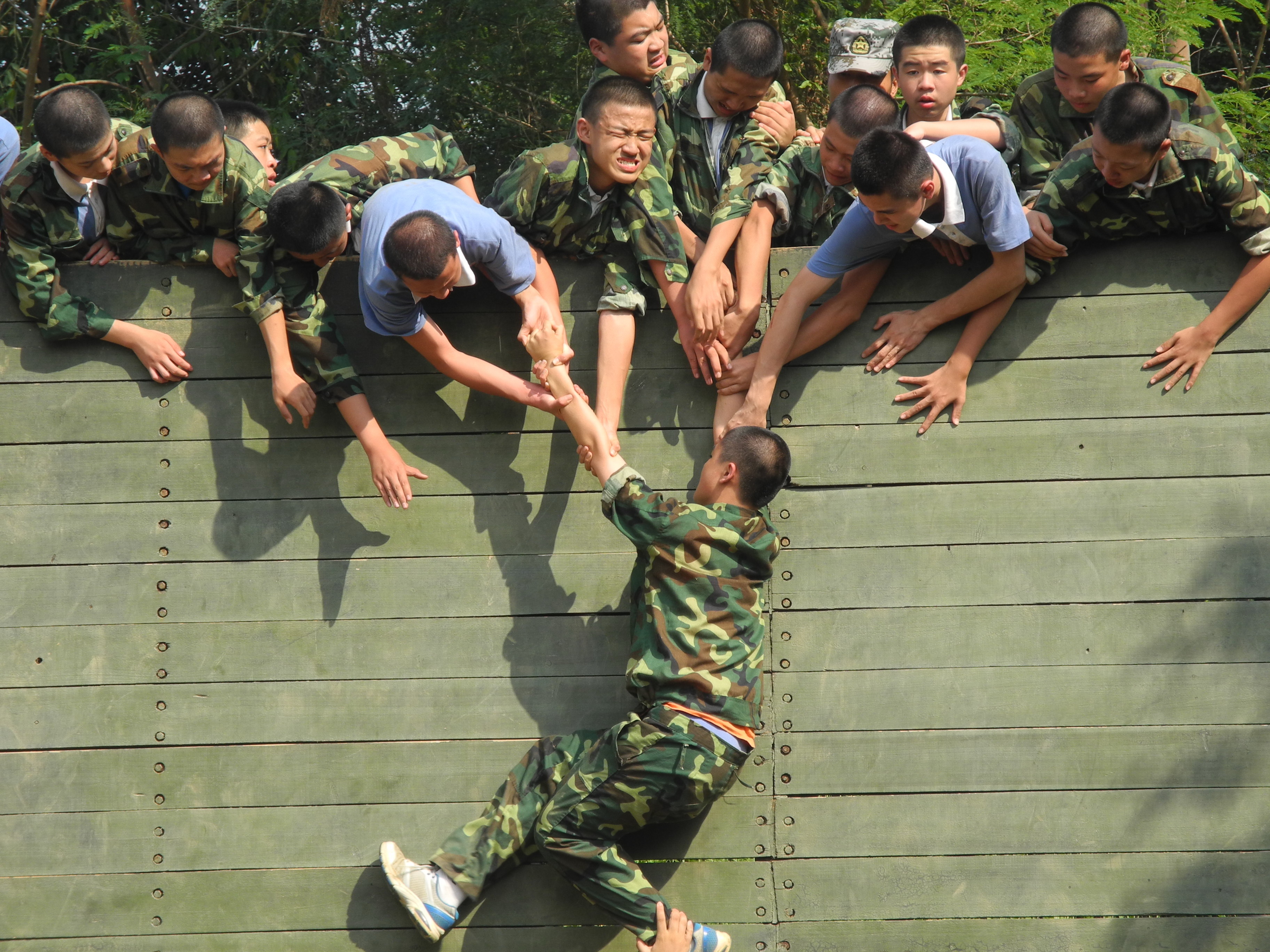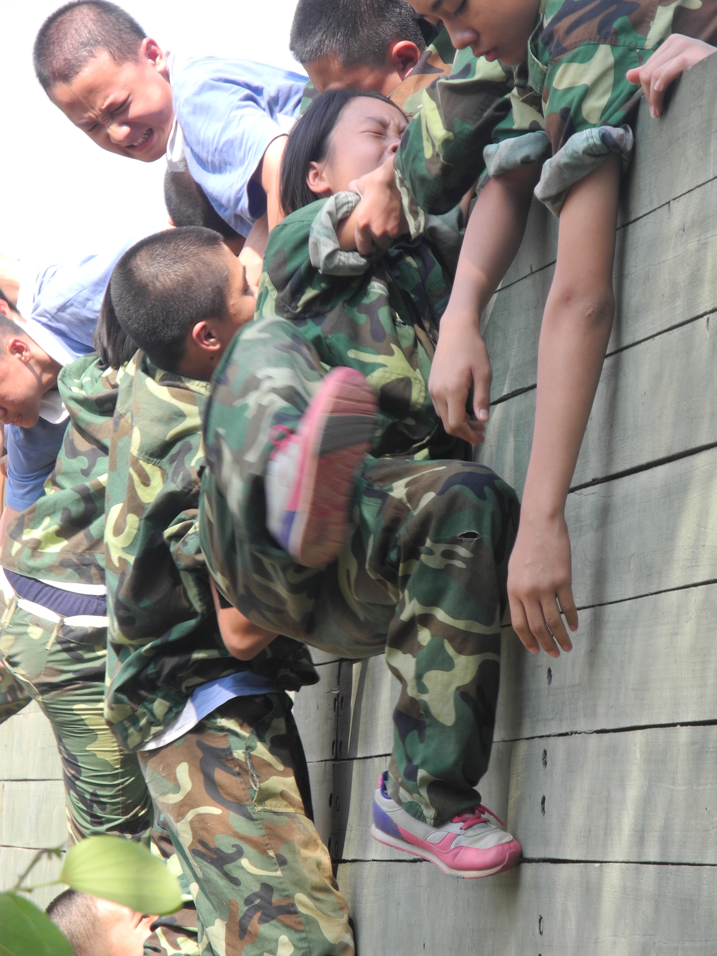 当最后两名一直在做“人梯”的同学登顶时,所有的同学都屏住了呼吸!初二(14)班刘鑫龙同学义无反顾地选择了“人梯”,把最后的机会留给了同伴,用肩膀把同伴顶上了4.2米的高台。而等待他的是100个俯卧撑,他毅然决然地坚持做完了100个俯卧撑,男生自发地都做起来俯卧撑,女生早已泣不成声了,刘鑫龙用他的行动诠释了一个士兵“不抛弃,不放弃”的精神,最后所有的女生伸出他们柔弱的双手把刘鑫龙举上了高墙!活动在一片雷鸣般的掌声中结束!但我们激动的心却久久不能平息。