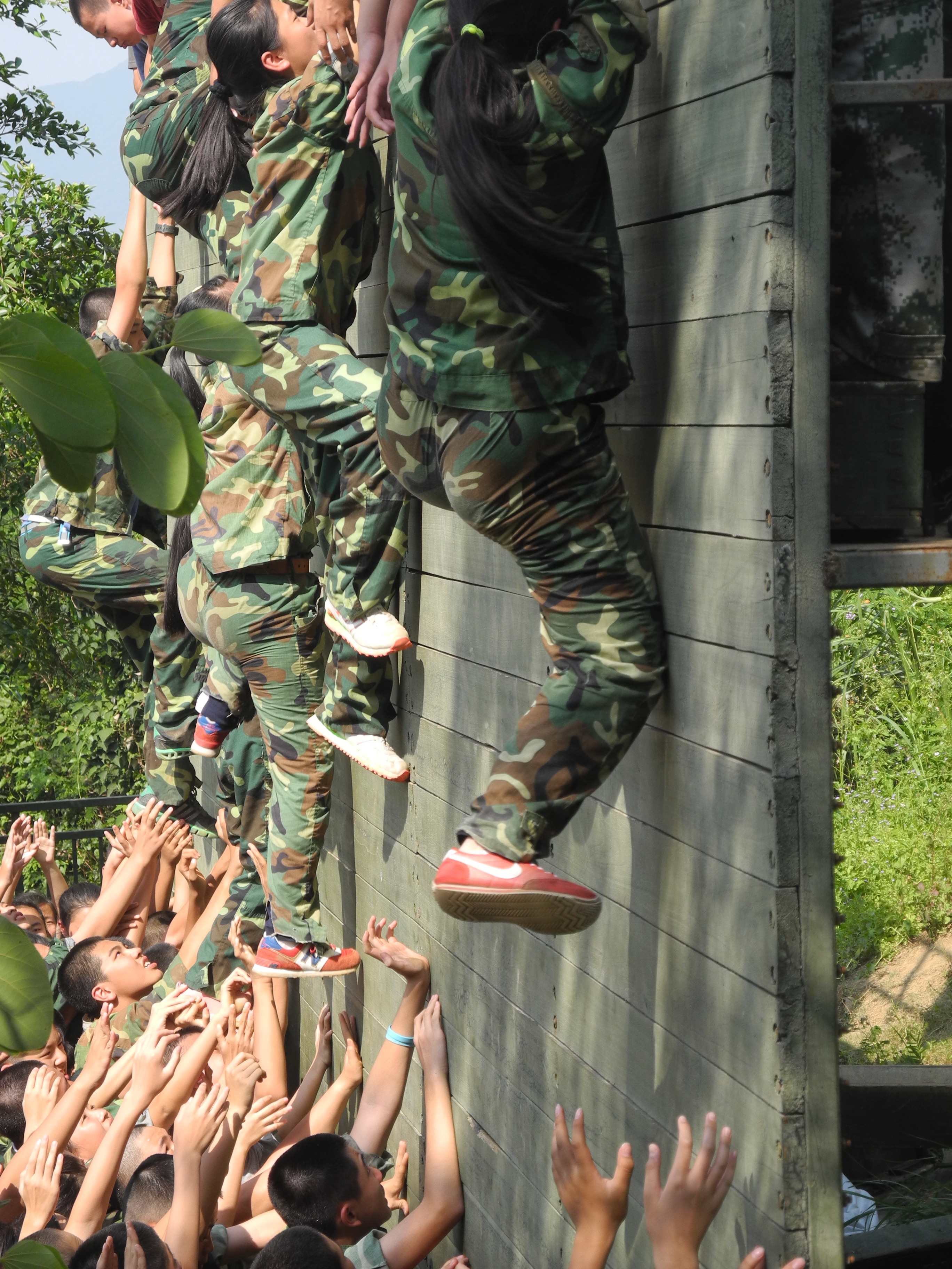 26日的活动最精彩,也最激动人心。上午,以班级为单位进行“信任背摔”,高个有力的男生用自己的胳膊搭起坚强的后盾,站在队友倒下的方向,其他队员轮流站在高高的背摔台上,背对着大家,喊“准备好了吗”,回答均是整齐嘹亮的“时刻准备着!”“我倒了!“你倒吧,我们接住你!”站在台上的同学在一问一答之后倒下,落入下面伙伴组建的臂床上。对台上背摔的人而言,克服胆怯心理,相信同伴的力量,果断、勇敢地向后倒下去,是取得成功的关键。此项活动提高了同学间的信任度,同时也是对团队的默契和高度和谐的考验。