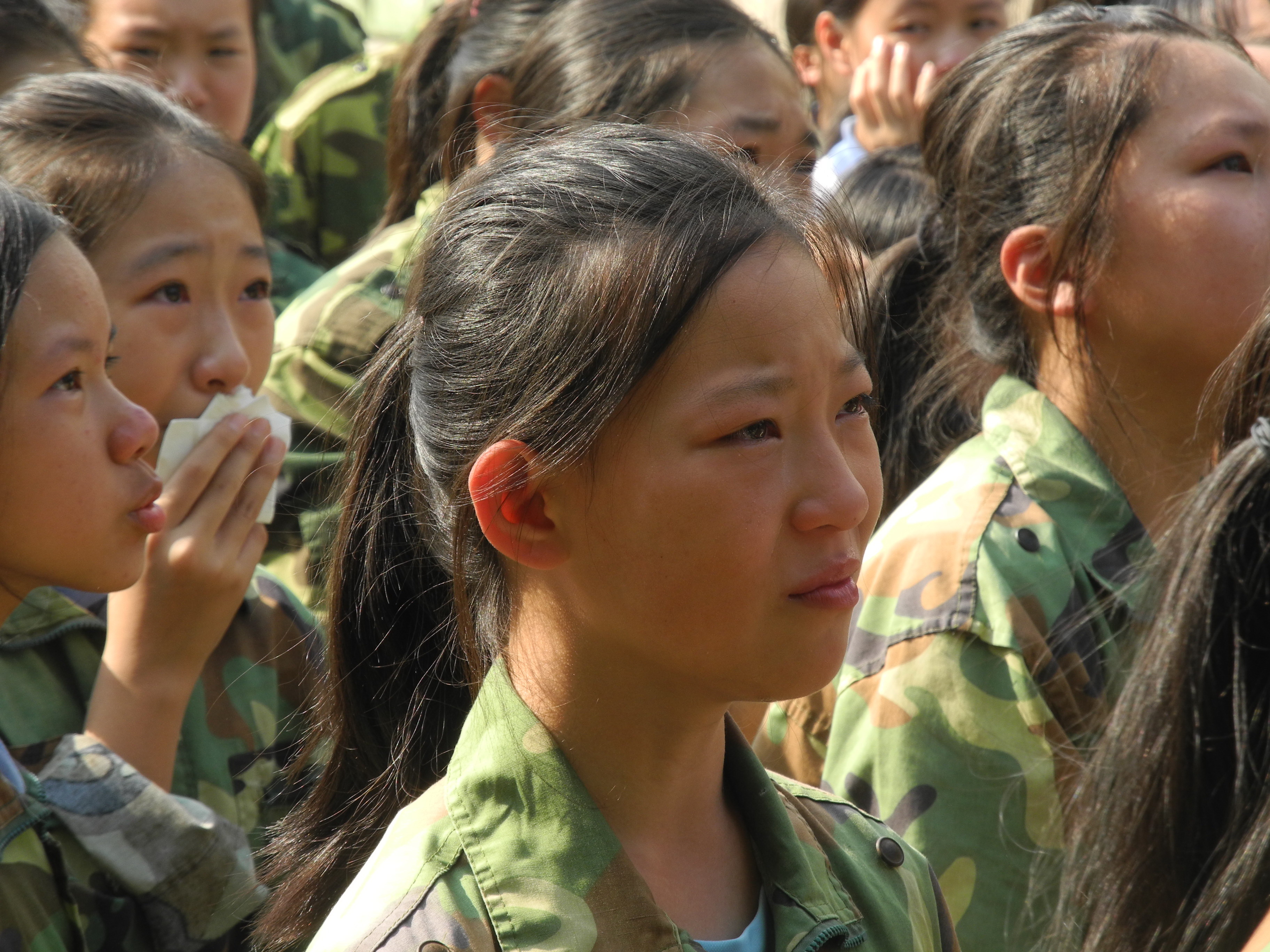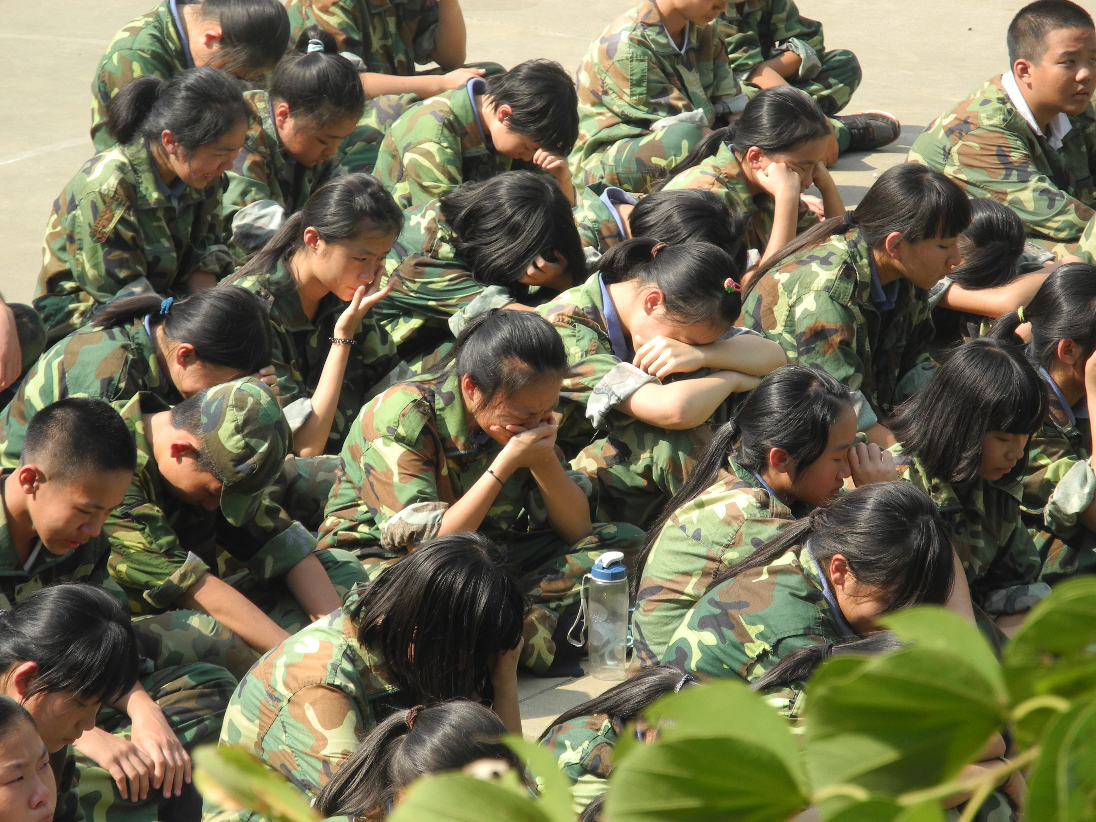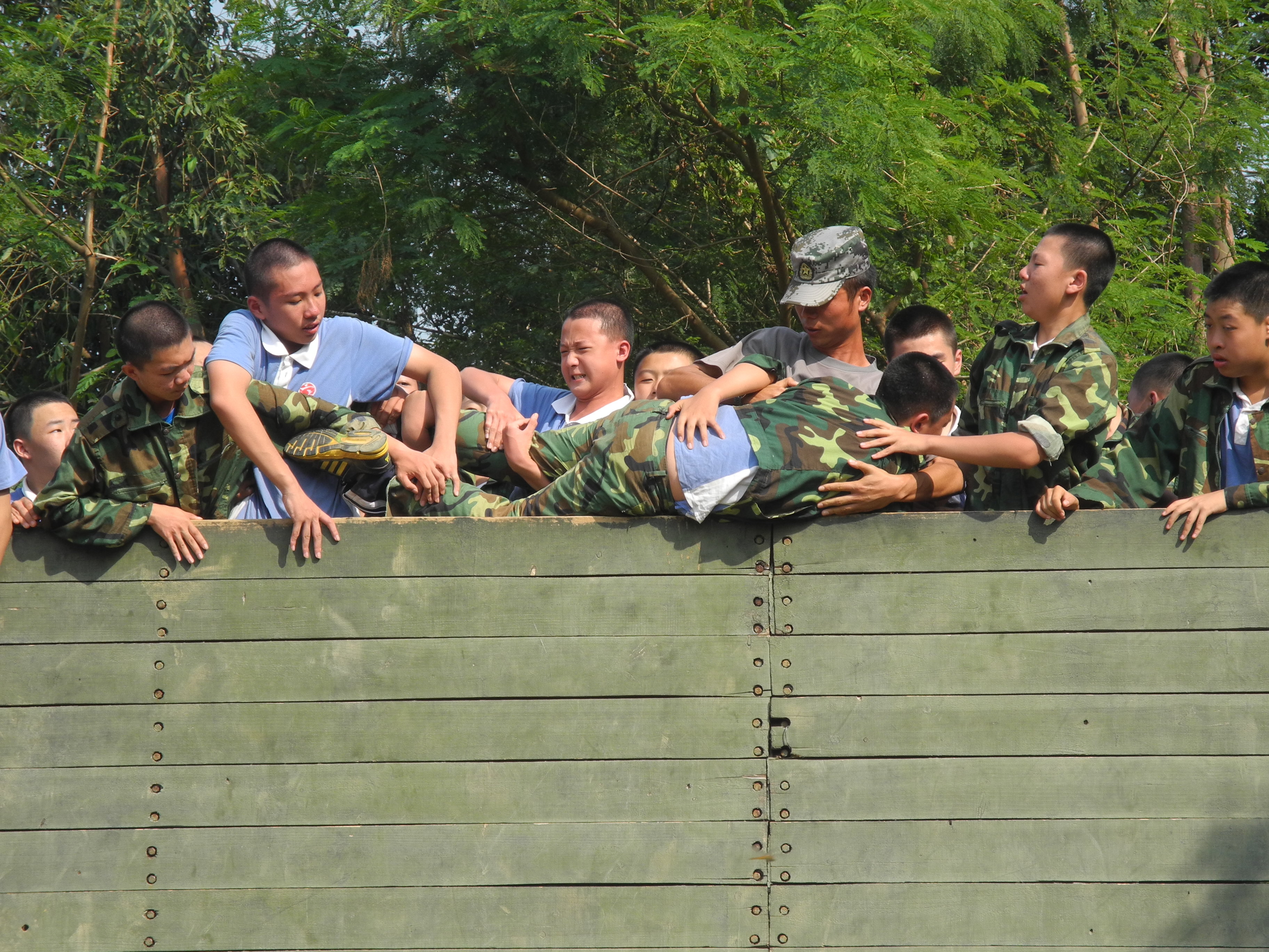 翻越“感恩墙”活动将拓展训练推向了高潮。 站在4.2米的高墙下,同学们没有丝毫的畏惧,高大强壮的男生勇敢地甘做人梯。所有同学一齐涌向高墙,不约而同地都举起了双手,五分钟内,有同学借助“人梯”翻越了高墙,接着两个、三个、四个……第一位女生翻越上去了,更多地女生翻越上去了……他们的呐喊声、喘息声、滑到声、军服撕破声,在鼓点般的背景音乐中,震撼人心!当看到“人梯”同学肩膀上的一道道血痕时,当看到台上和台下的同学在撕心裂肺的“加油”声中终于手握在了一起时,当看到有同学用头去顶别人的脚时,那挡在我们眼前的不再是一堵普通的高墙,而是一道“生死墙”,孩子们在生死墙前表现出的勇敢无畏,坚强不屈和团结一心的精神,深深地感动了在场的每一个人。左明云主任忍不住热泪盈眶了,班主任都哭了……终于,一半的同学成功地翻越了“感恩墙”。教官叫暂停,所有的同学坐下来休息,音乐响起,老狼的《睡在我上铺的兄弟》回荡在空中,全场泪奔了……泪水、汗水模糊了我们的视线,也更坚定了孩子们战胜困难的决心!