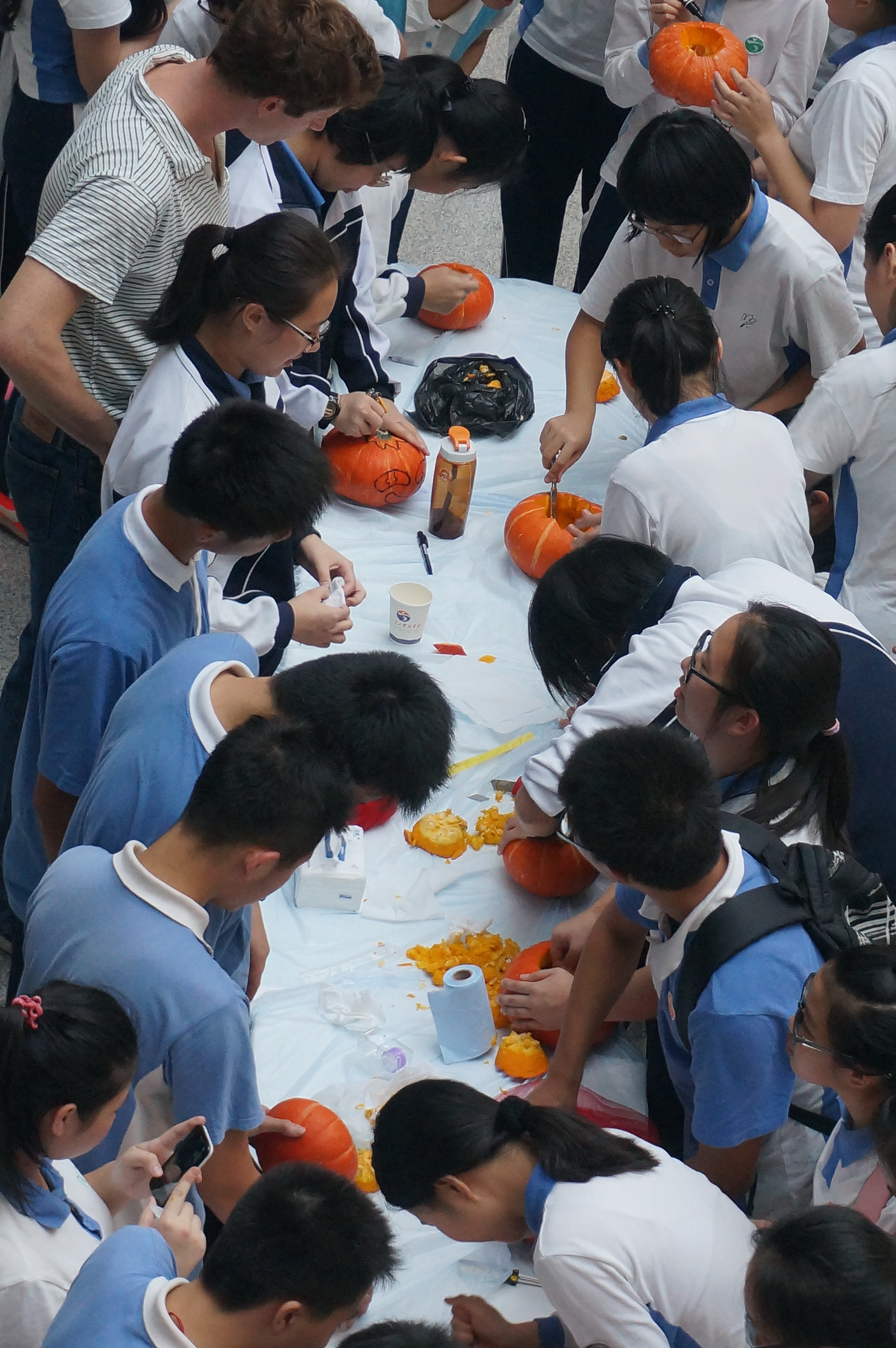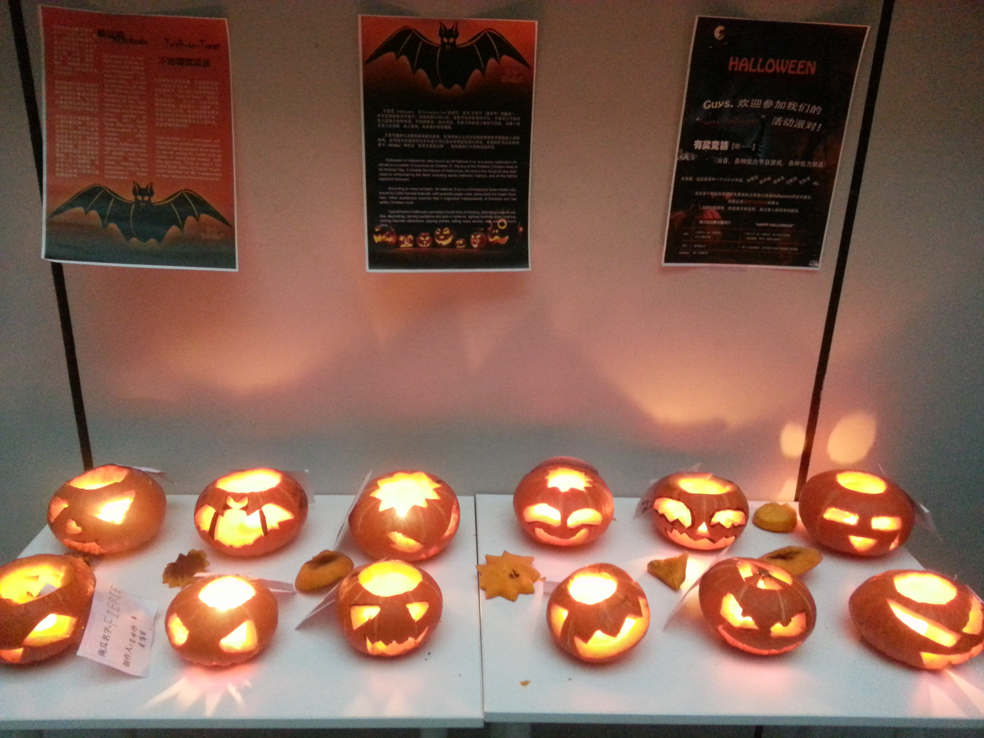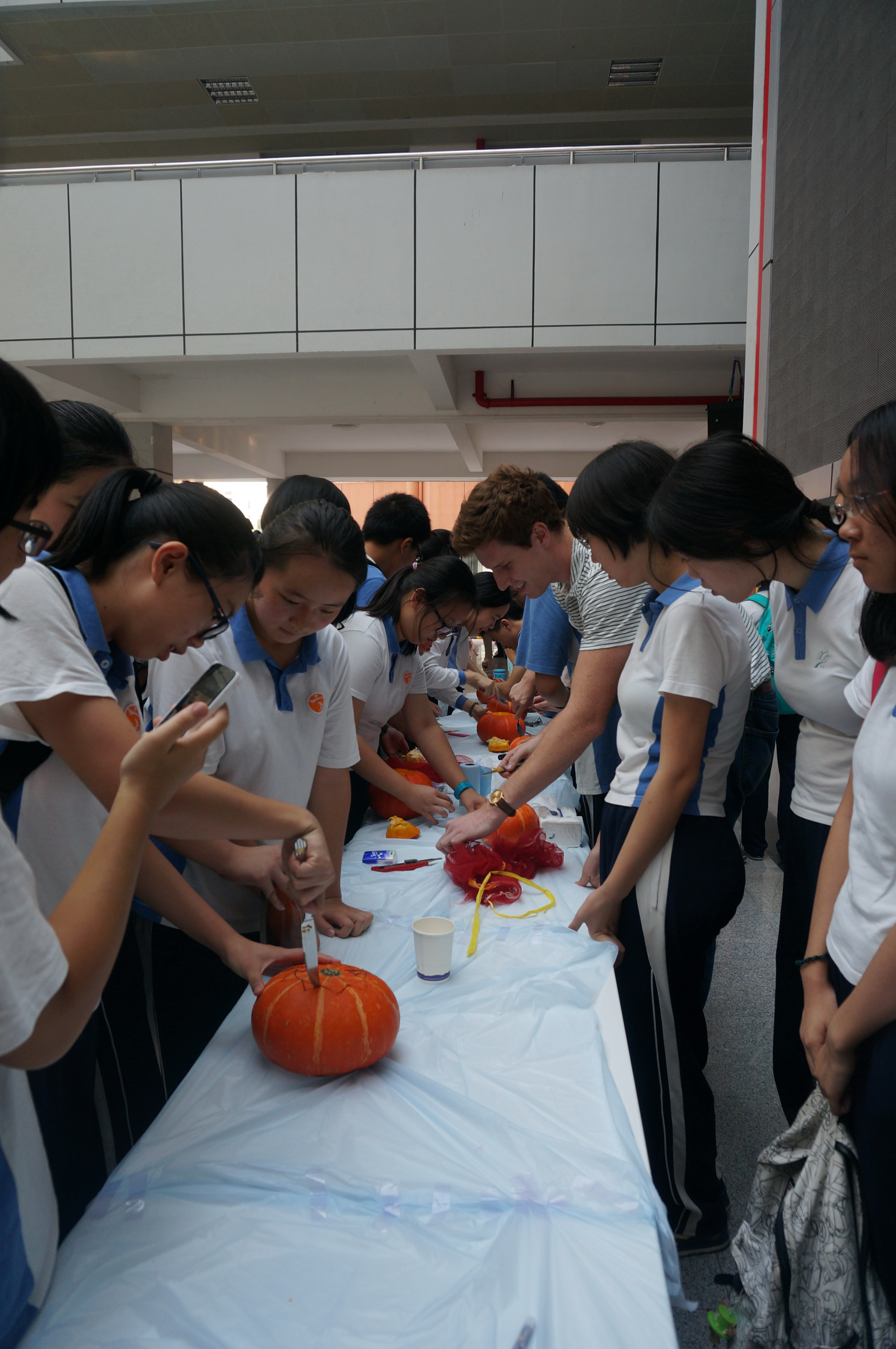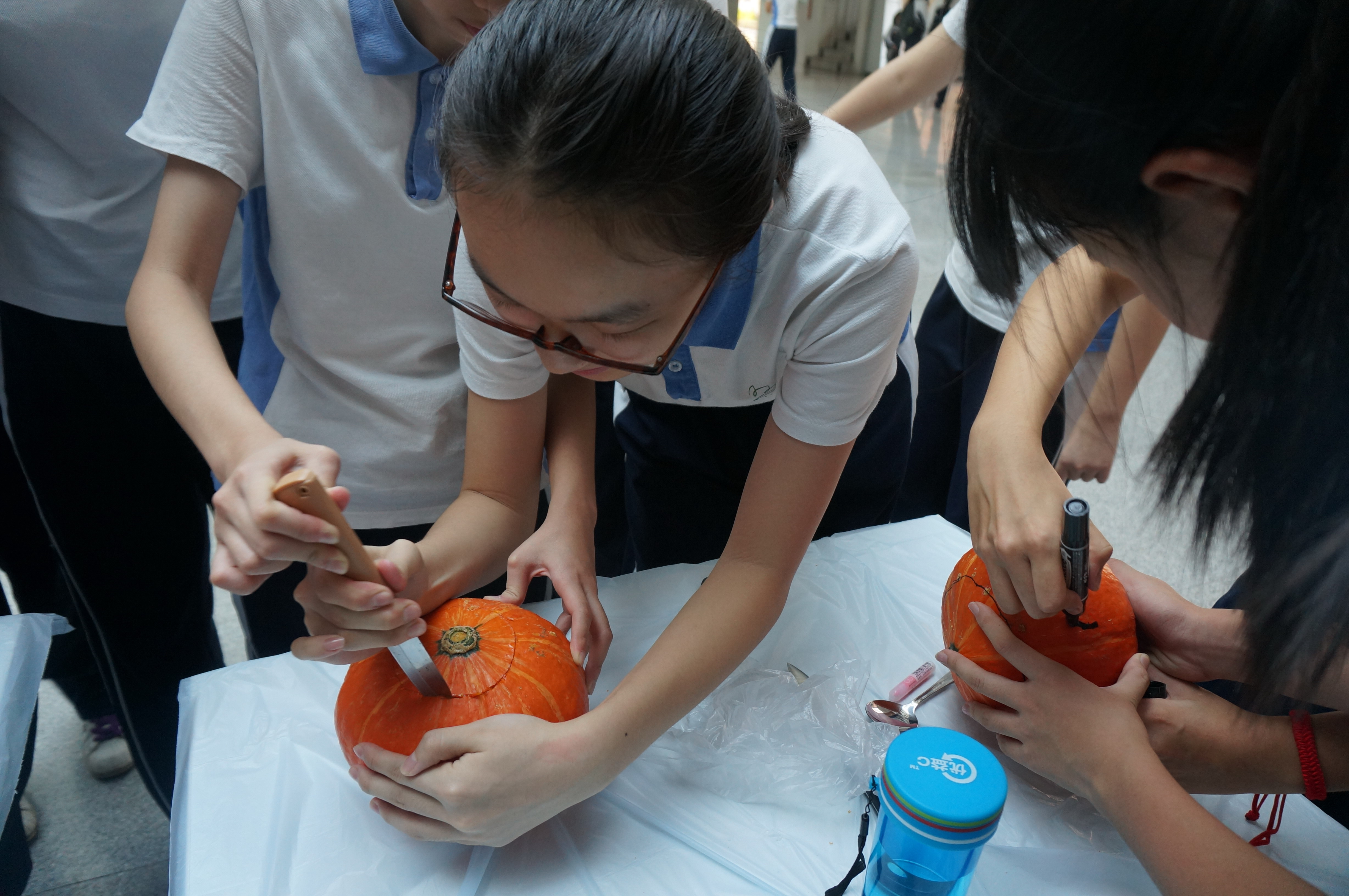 10月31日下午,高一国际班同学组织策划了万圣节雕刻南瓜体验活动。不少同学都是第一次动手雕刻南瓜,外教JACK现场指导,并与同学们谈论美国的万圣节文化。经过同学们的精心设计和细心雕刻,12只透出温暖烛光,形态可掬的南瓜灯展现在大家的面前。