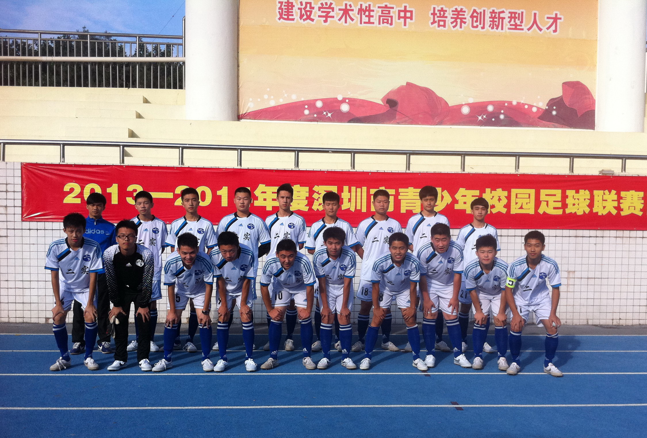 11月17日-12月15日,在市教育局主办的2013年深圳市青少年校园足球高中乙组联赛中,我校男子足球队充分发扬了奋勇争先、勇于拼搏的精神,在艺体中心谭超主任和球队彭俊教练的带领下,经过5轮比赛,最终取得了1胜3平1负的不俗战绩,荣获联赛季军。