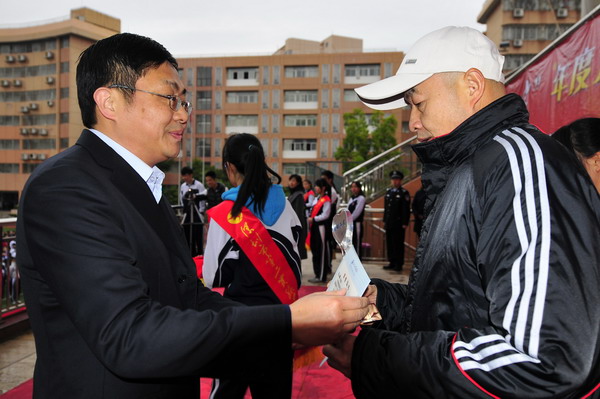 体育科组长燕涛老师代王小维老师接受赵立校长颁奖