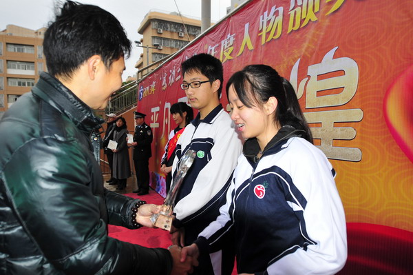 2月10日早上,高中部新学期开学礼暨“感动二实”2013年度人物颁奖礼隆重举行。荣膺“感动二实”2013年度人物的6位获奖者分别是带领校女篮成长为全国中学生顶尖球队的教练王小维、从教三十年来敬业奉献的赵丽英老师、来自黄贝派出所碧波社区的法制辅导员毛顺义警长、乐于助人的学长团总团长彭楚舒同学、在全国信息学奥林匹克竞赛中两次获得全国一等奖的姚力涛同学和热心支持教育的初中部家长志愿团负责人胡彩洁女士。在高中部师生的阵阵热烈掌声中,分别由学生、教师及学校相关工作负责人为“感动二实”2013年度人物致颁奖辞,校领导为他们颁发了奖杯。