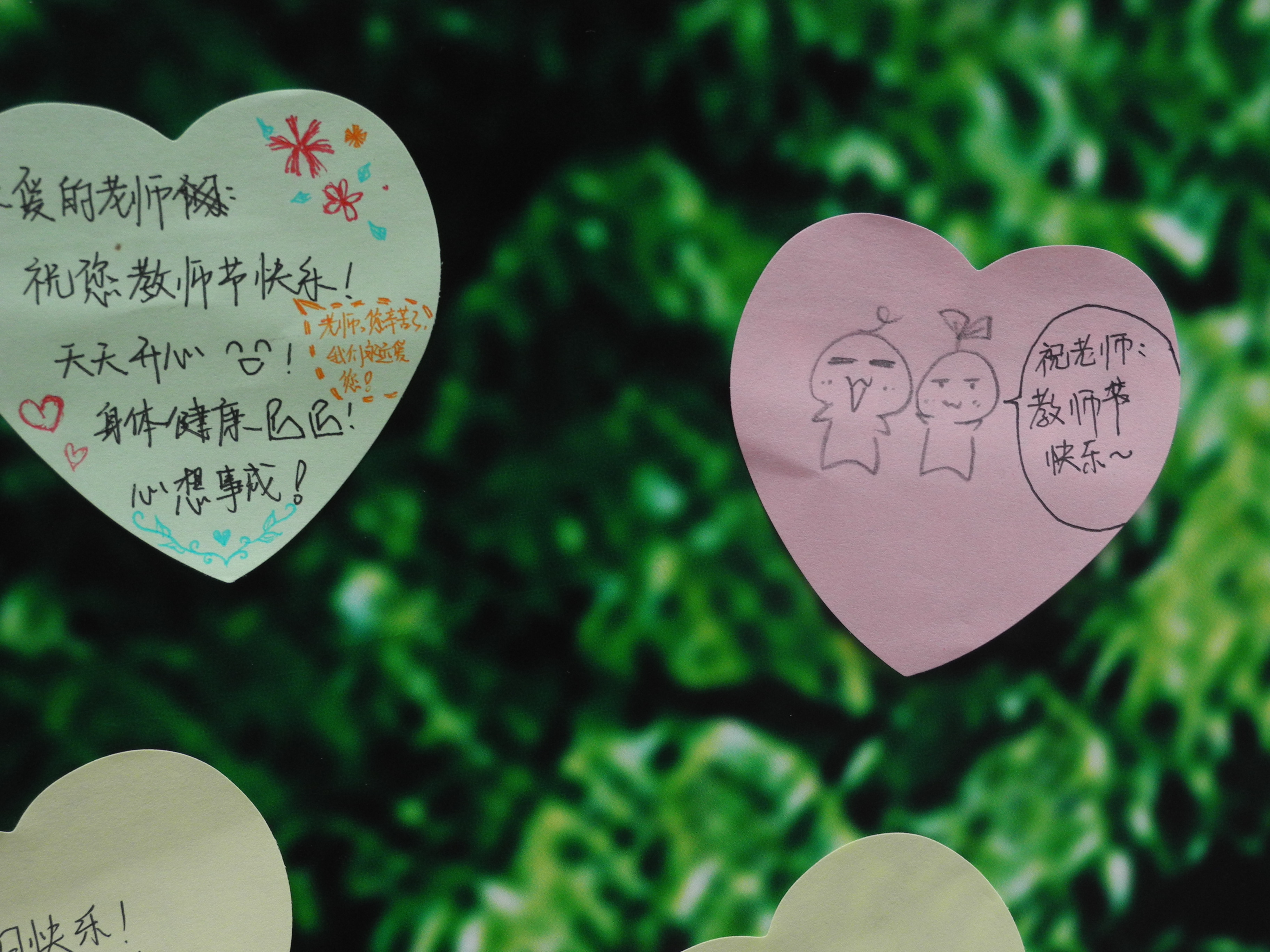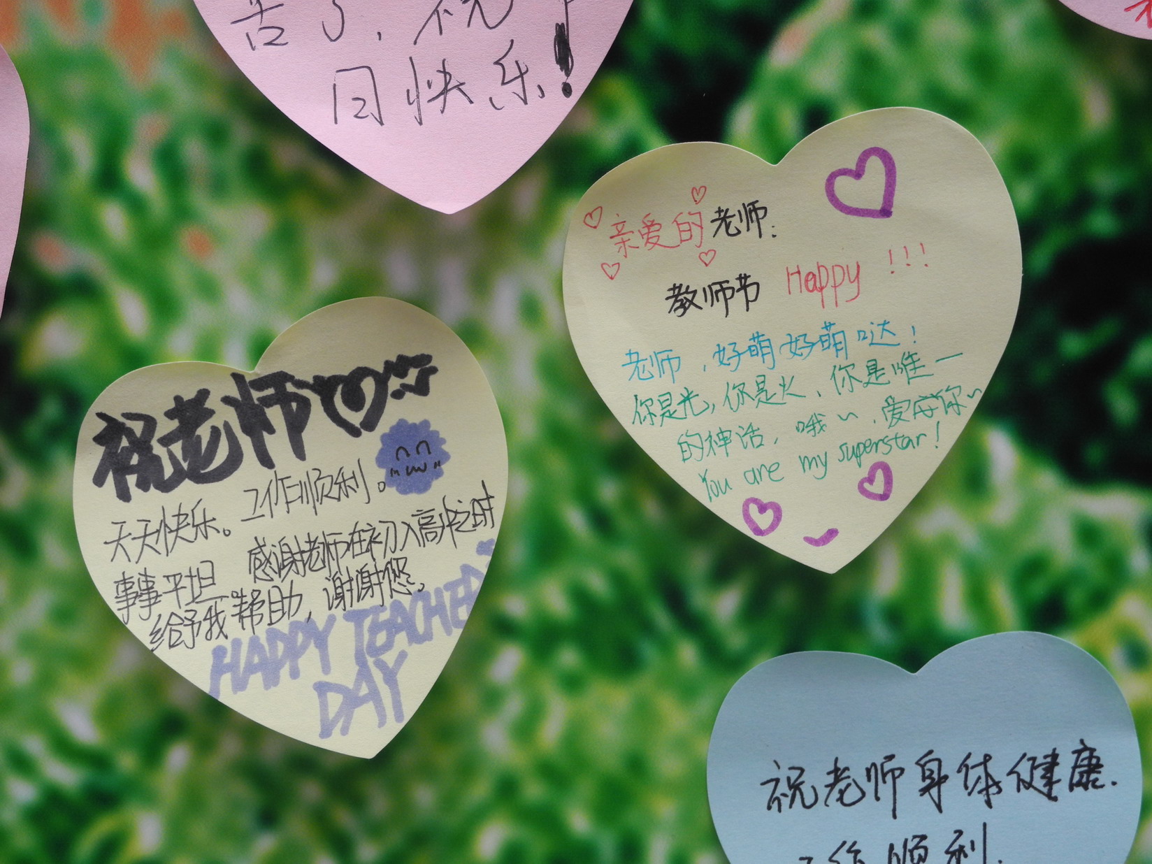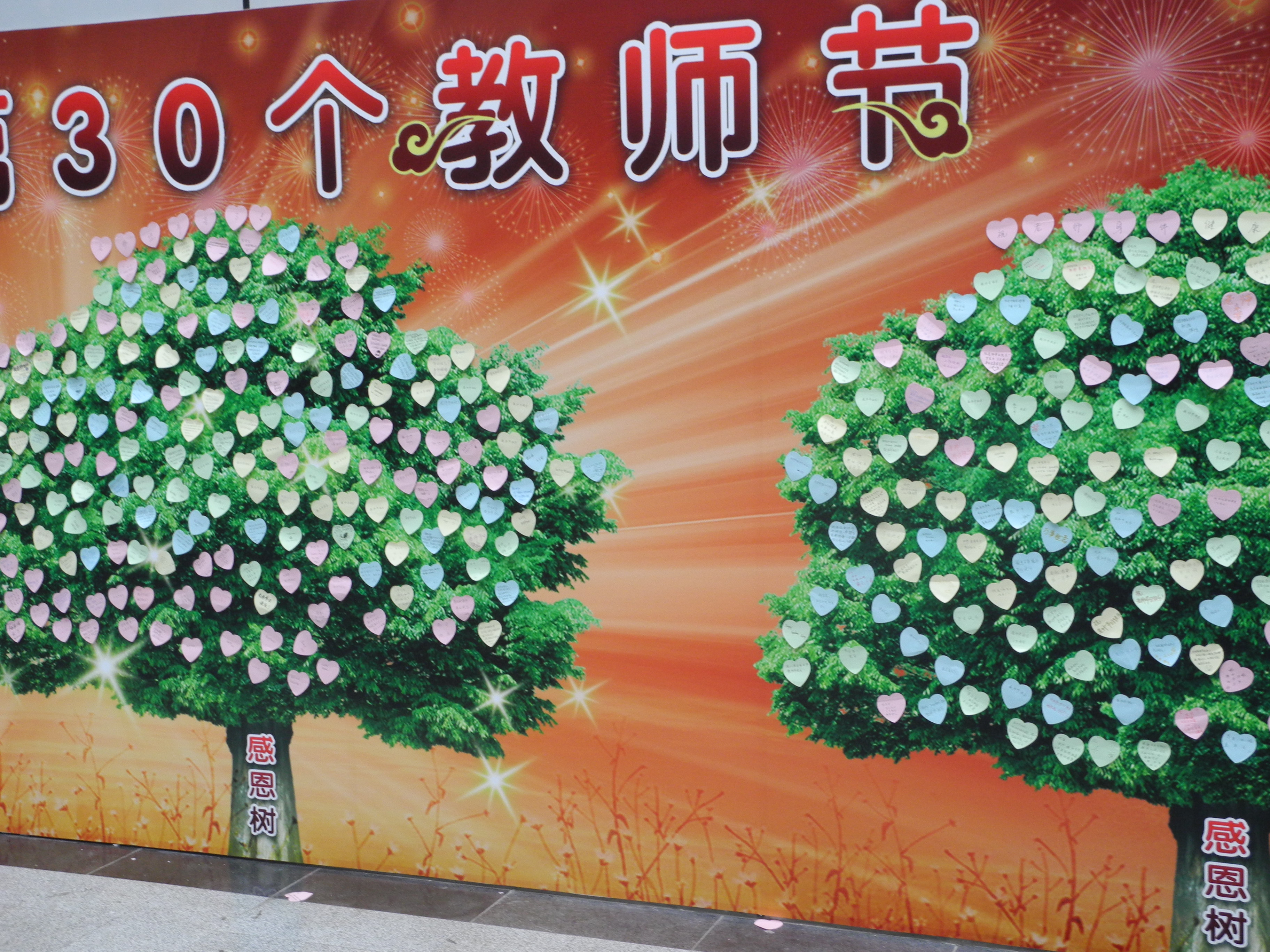 校园的大屏幕上,滚动播放着同学们自己制作的幻灯片,表达着对老师深情的祝福;教学楼中厅的墙壁上,装饰着三棵绿色的感恩树,树上贴满了“心”形的祝福卡,各班同学在上面写上了自己对老师的祝福。五颜六色的卡片,各具特色的语言,装点出了温馨的气氛。看,有的卡片上写着“老师,你是我的小苹果!”有的卡片上写着“我的世界,因为有你们才完美”,满满的祝福,再加上超萌的漫画,让老师们感动又暖心。