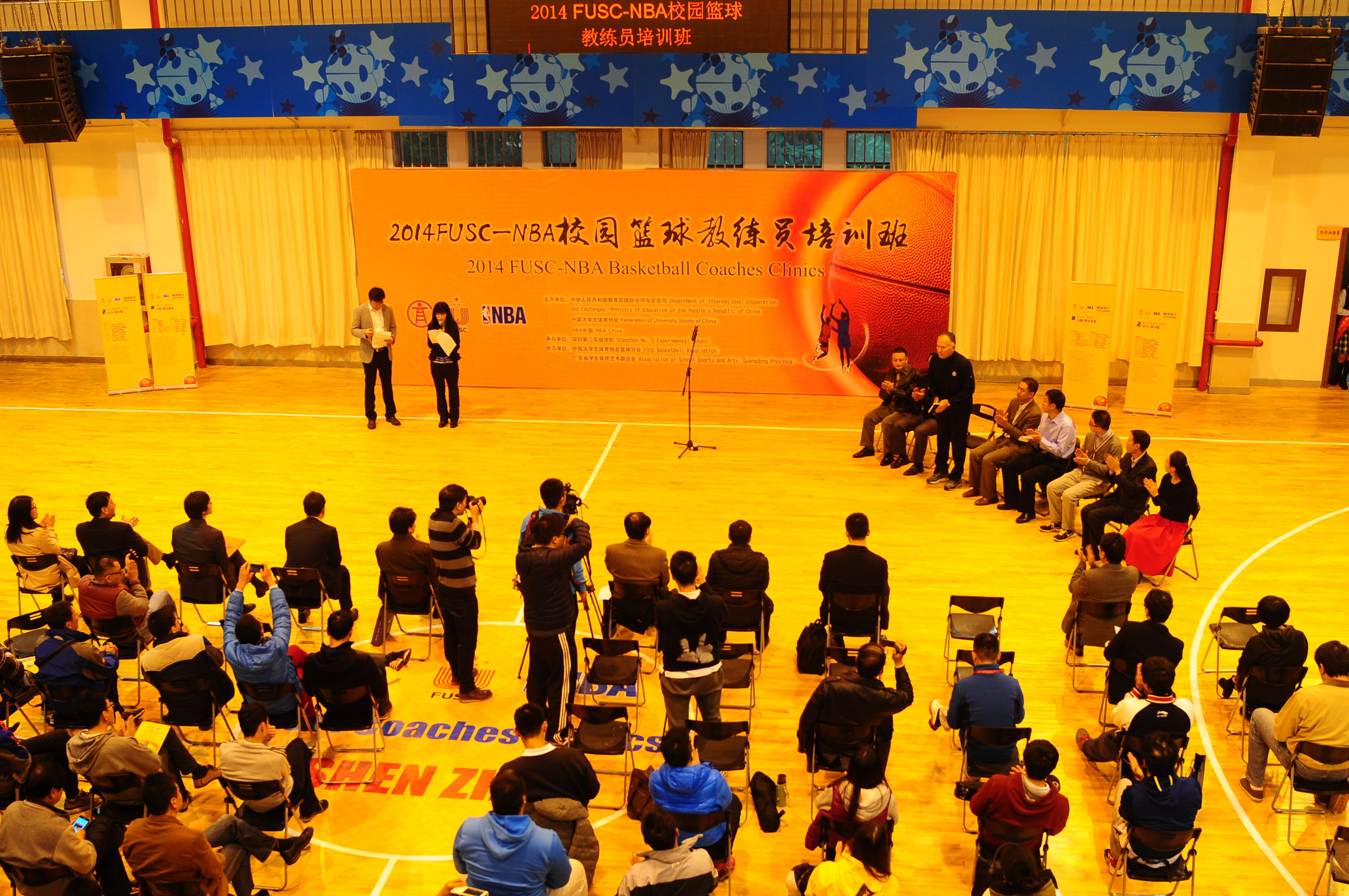 12月8日上午,由中国大学生体育协会(简称“大体协”)与NBA首次联合举办的2014FUSC-NBA全国校园篮球教练员培训班在我校初中部文体馆开幕。