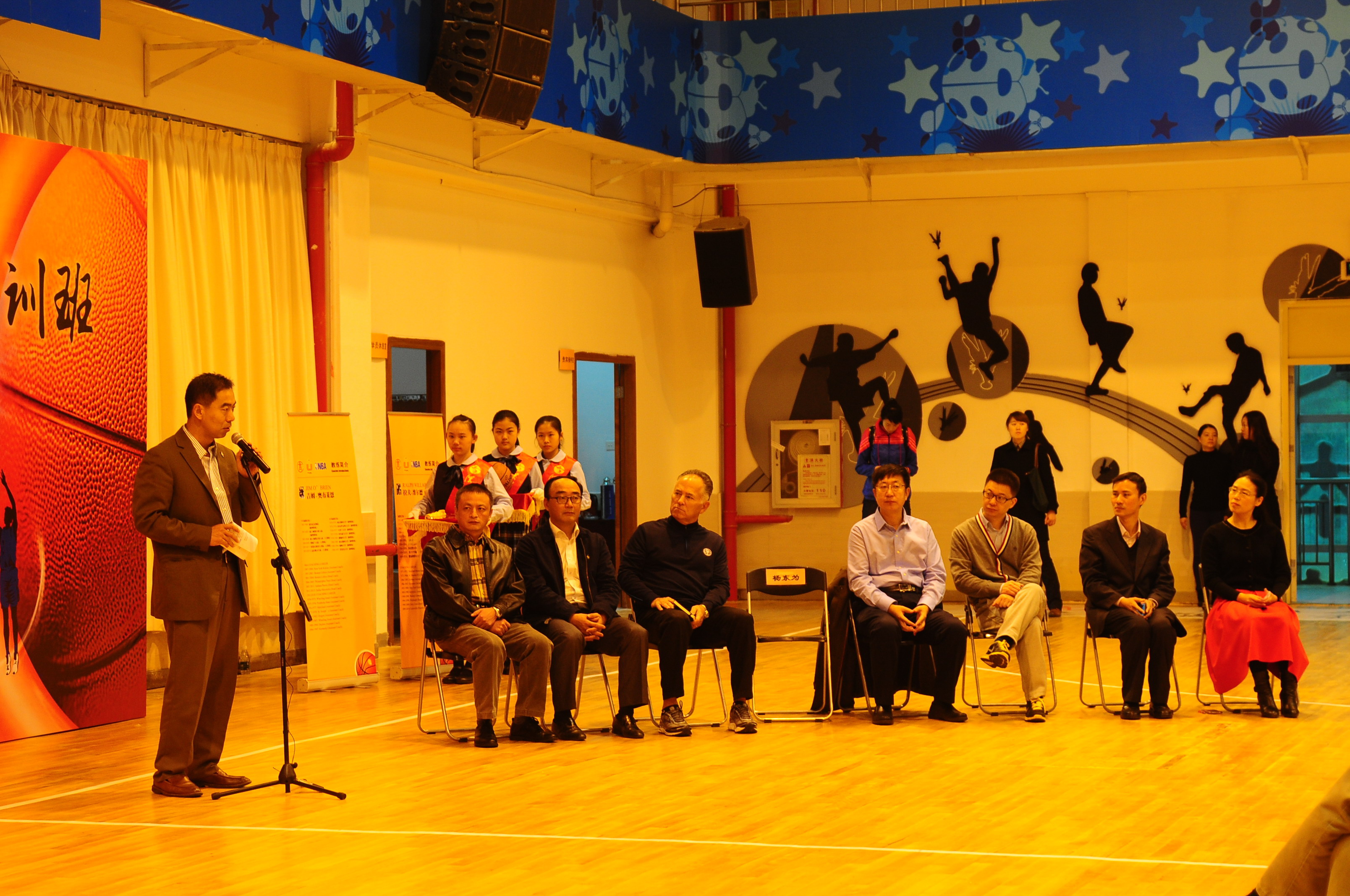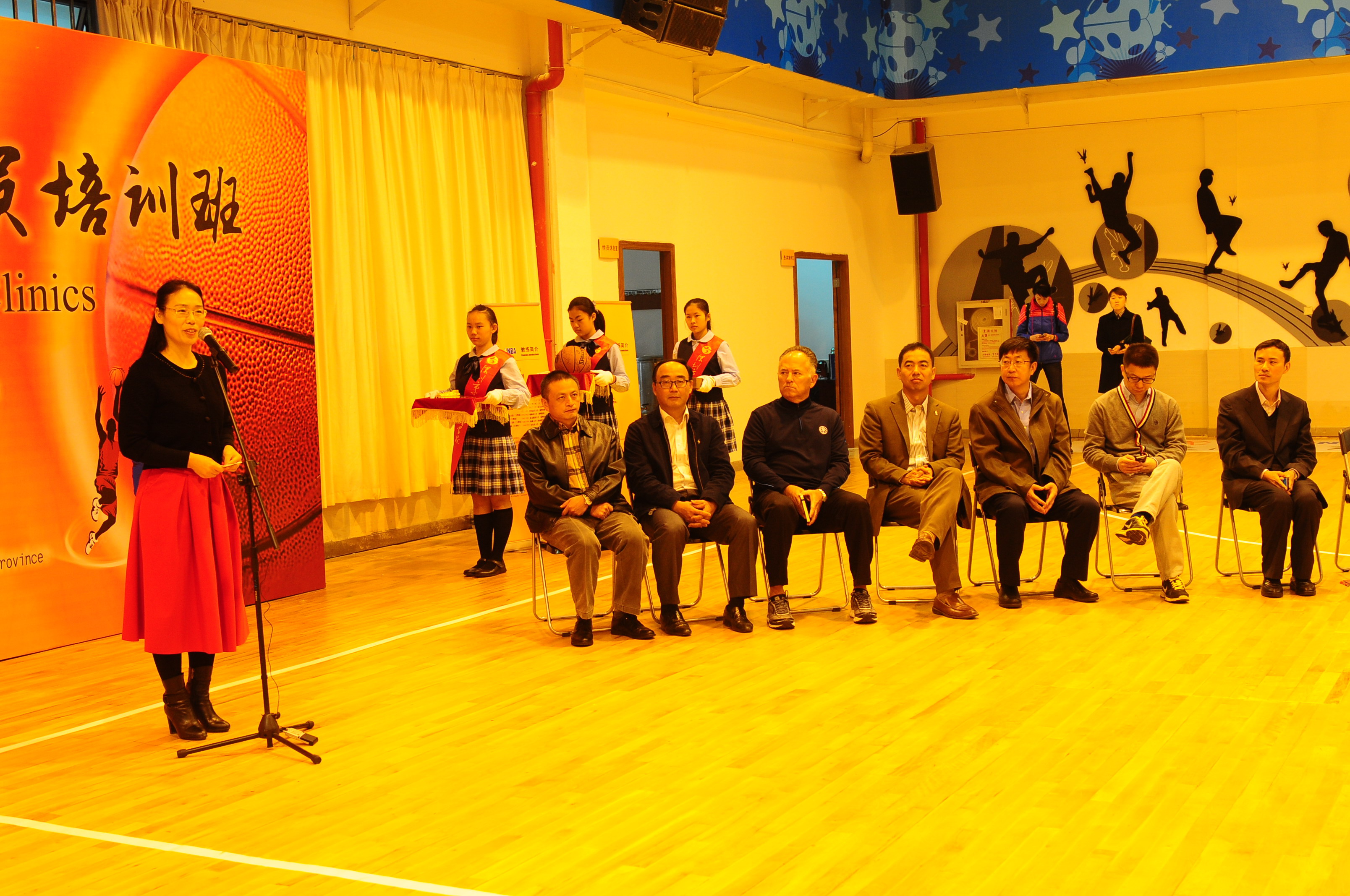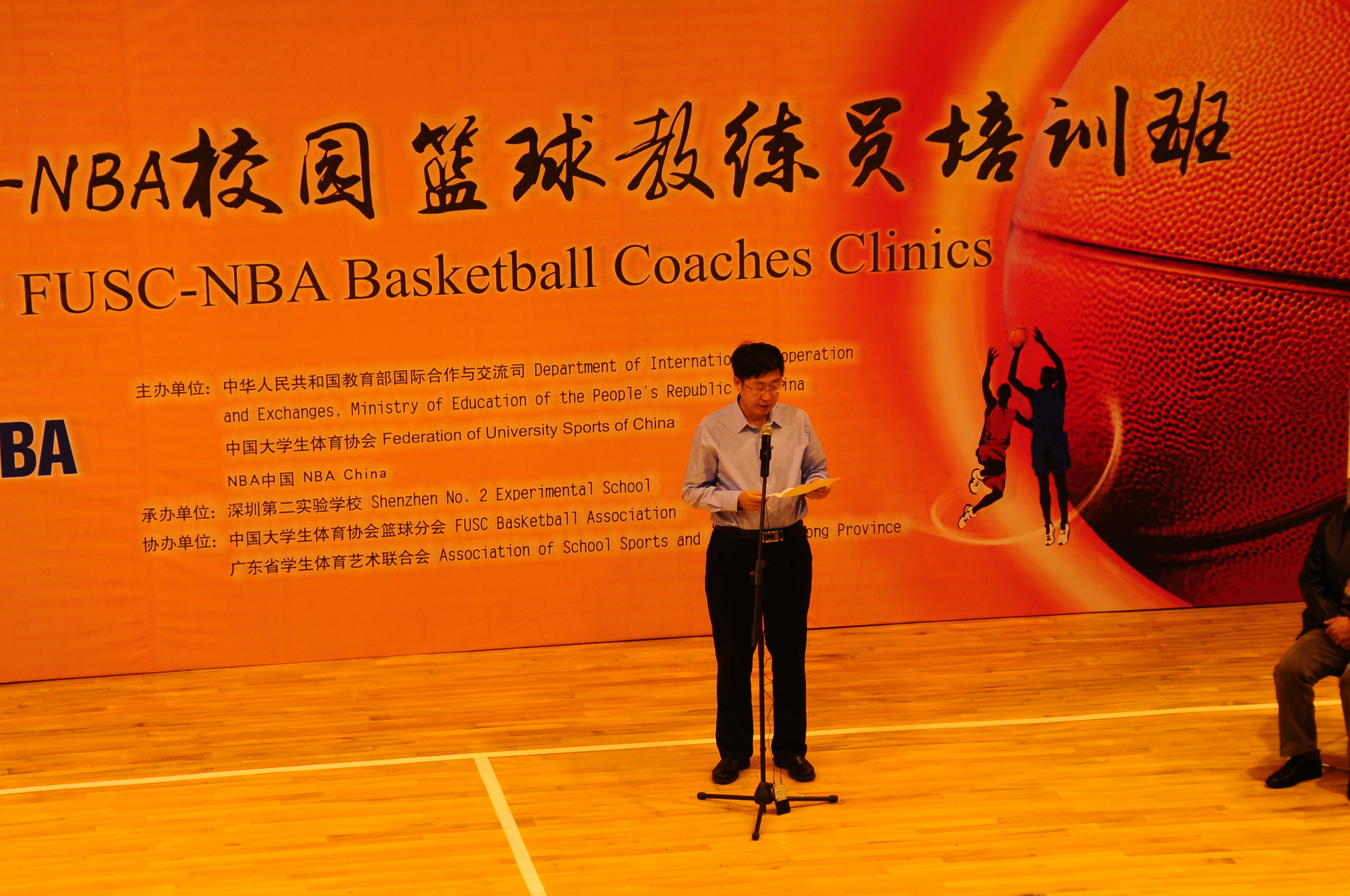 主办方大体协薛彦青副主席、NBA中国高级副总裁杨东为先生出席开幕式并致辞,教育部体卫艺司体育处卢迅处长、国际部陈大立主任、国际司美大处陈云龙处长以及省教育厅体卫艺处侯波副处长、市教育局范坤副局长等领导莅会。来自全国各地的近120名大中学校篮球教练员参加开幕式,并将在我校进行为期一周的培训。