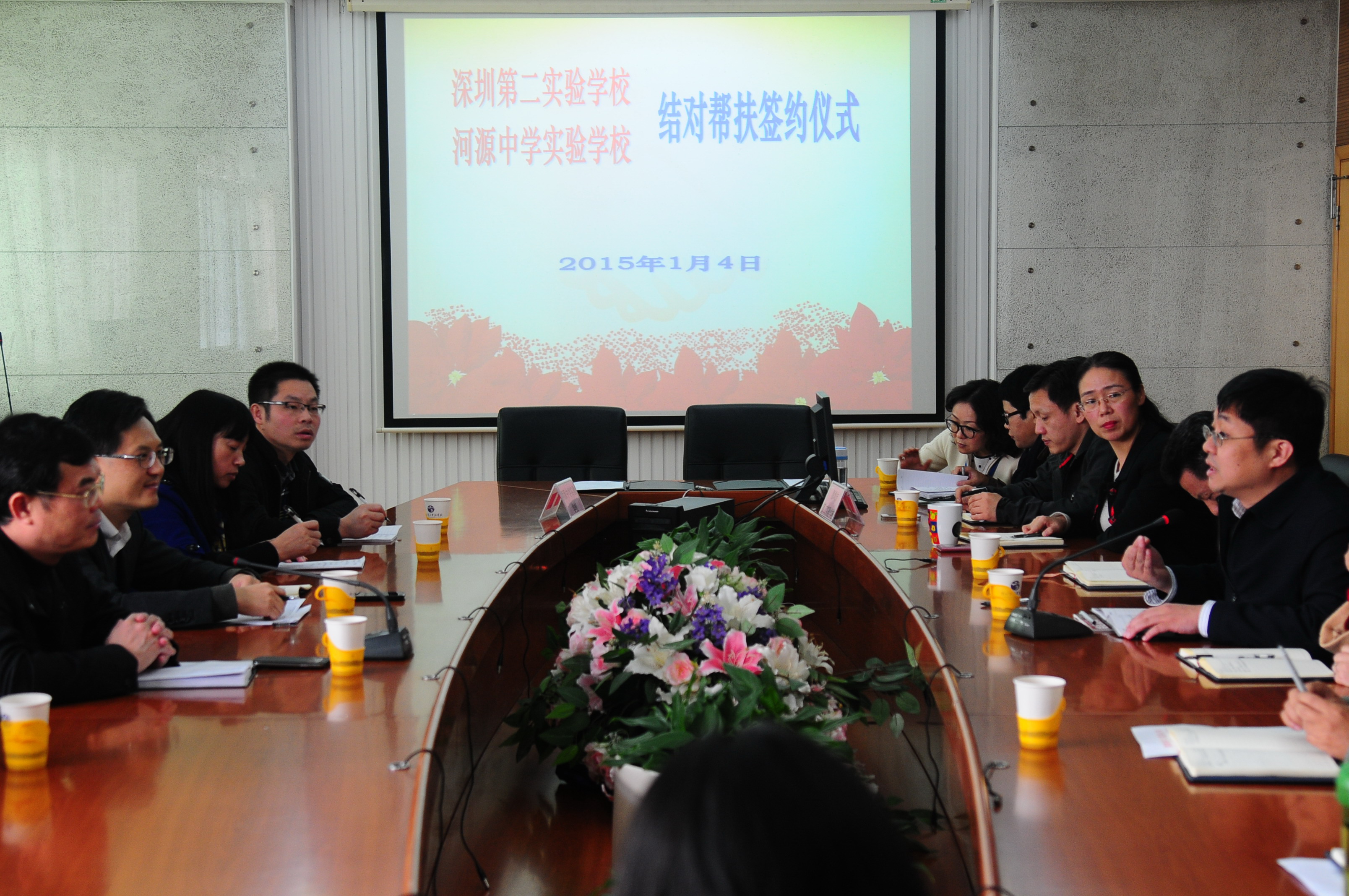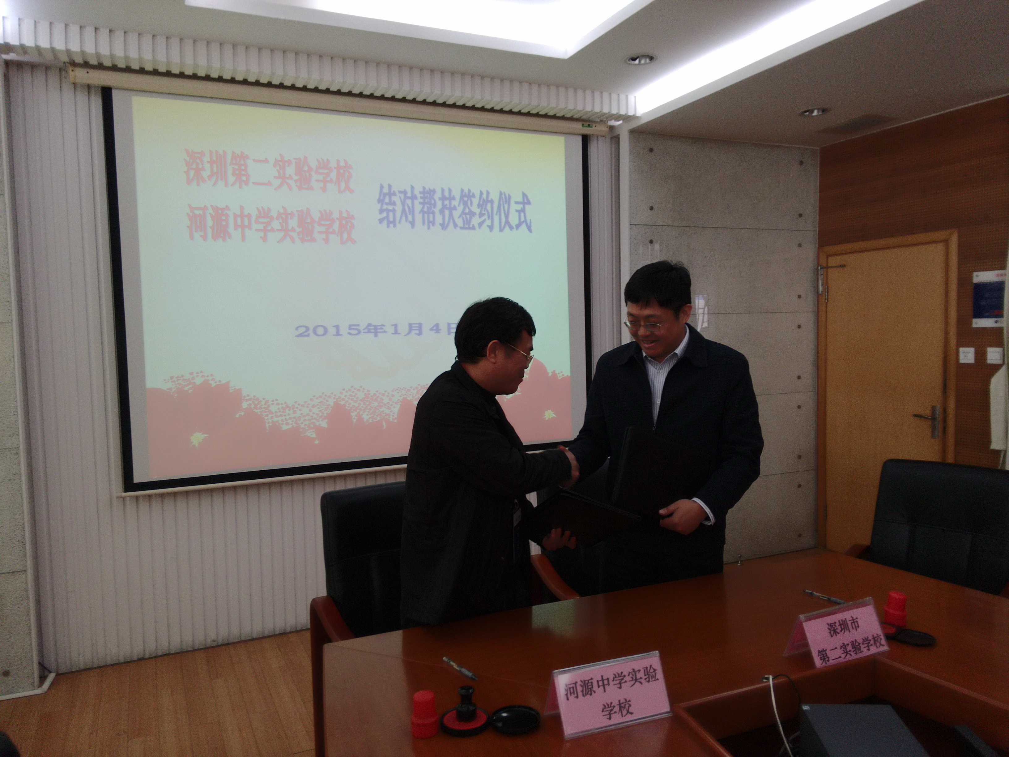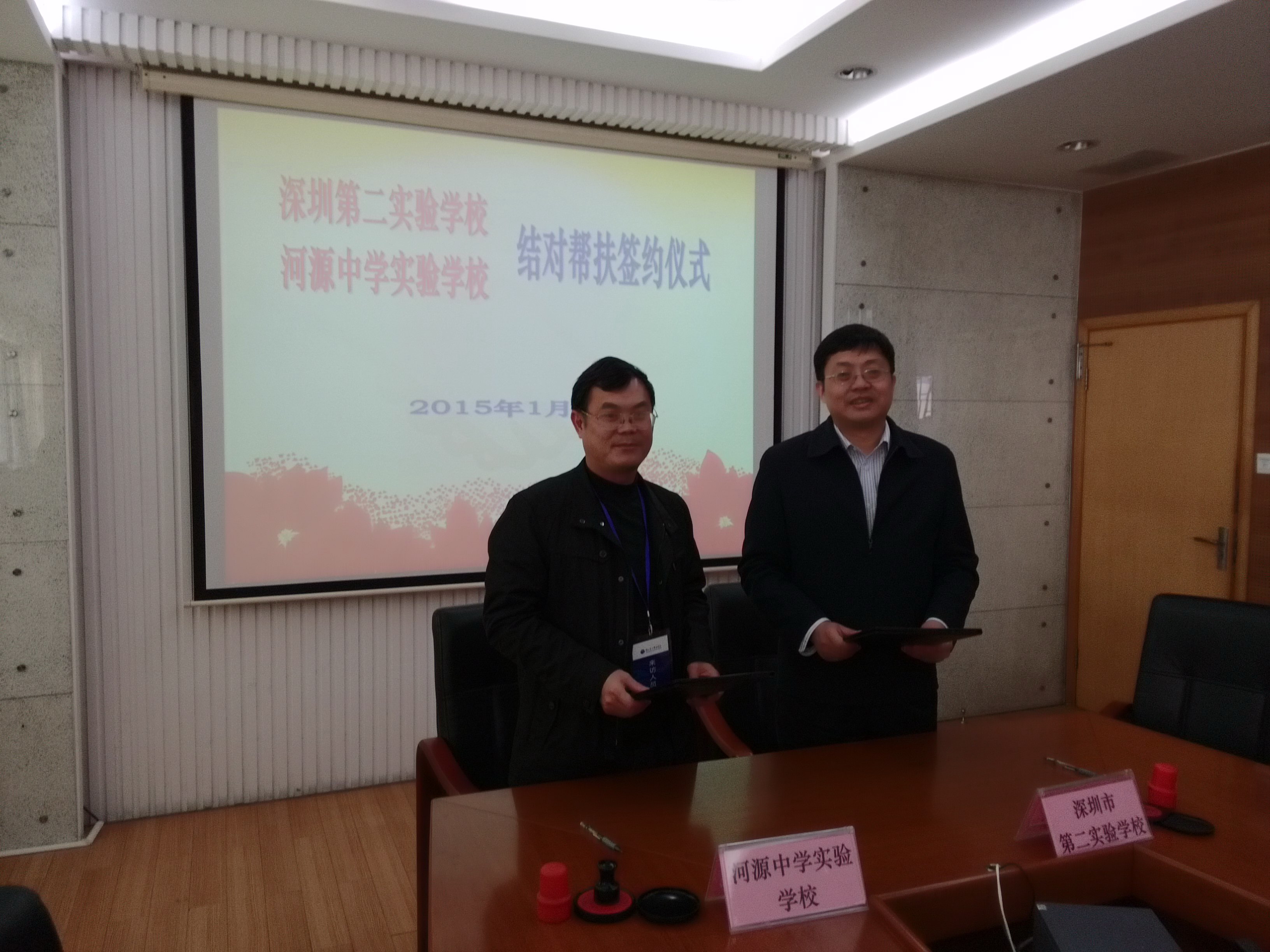 1月4日上午,我校与河源中学实验学校结对帮扶签约仪式在初中部三楼会议室举行。深圳市对口帮扶河源指挥部社会民生组组长黄东明(挂河源市教育局副局长、市教育局人事处副处长)、赵立校长、河源中学实验学校张定红校长等参加了仪式。
