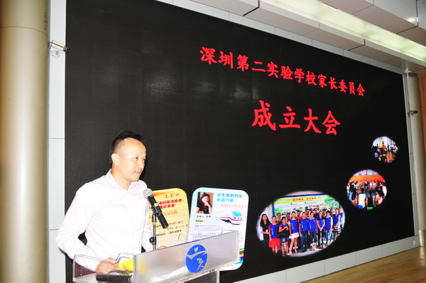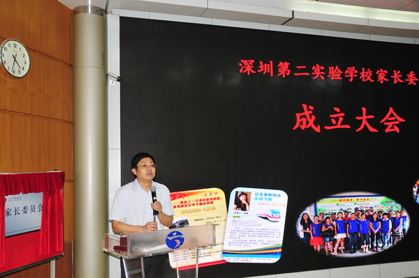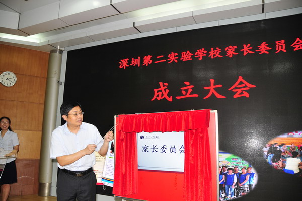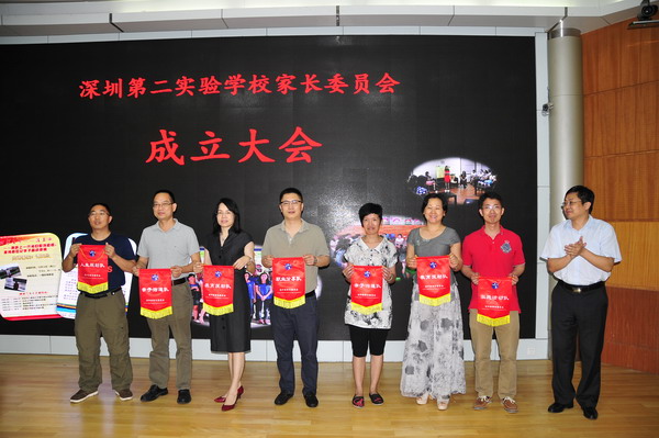成立大会由李雅萍副校长主持。会议播放了以“创新校园,领跑未来”为主题的我校宣传片,讨论通过了《深圳第二实验学校家长委员会章程》。校领导为家长委员会揭牌,向七位志愿队长授旗,为家委会负责人和常务委员颁发了聘书。高、初中家委会主任黄立新和刁洪涛先生在发言中高度评价学校工作,称二实为“暖校”,是孩子成长的乐园,感谢学校给了家长见证和参与孩子成长过程的机会,表示将积极配合、支持家委会工作,家委会将和学校一起合力承担教育孩子的重任。