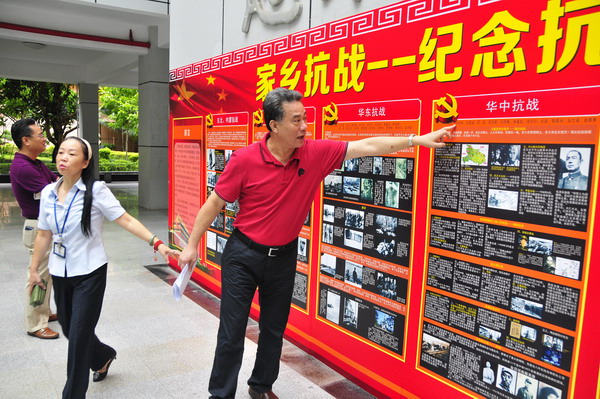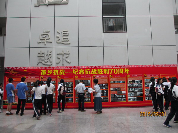 新学期开学第一天,高中部教学楼中厅《家乡抗战——纪念抗战胜利70周年》展览引人注目,吸引了大批师生驻足观看。