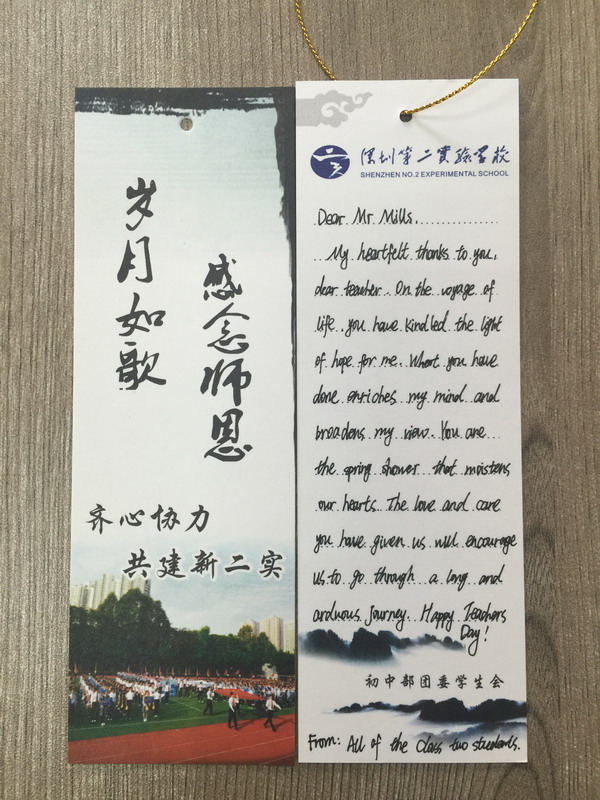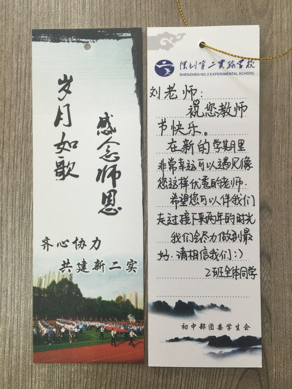 初中部的老师们都收到了一张“岁月如歌,感谢师恩”为主题的小书签,书签的一面是学校体育季学生的活动照片,另一面则留给同学们自由抒发对老师的感谢和祝福。“心语小书签”活动由初中团委发起,团委统一设计制作小书签,同学们领取后在书签上写下对老师的祝福语,以此向老师表达感恩之情。此外,团委还策划了“幸福小微博”的活动,鼓励同学们在自己的微博上发表原创微博说出想对老师说的话,并@二实团委学生会,学生会将替同学们转达心意,并在所发微博中随机抽取,博主将得到小礼品一份。