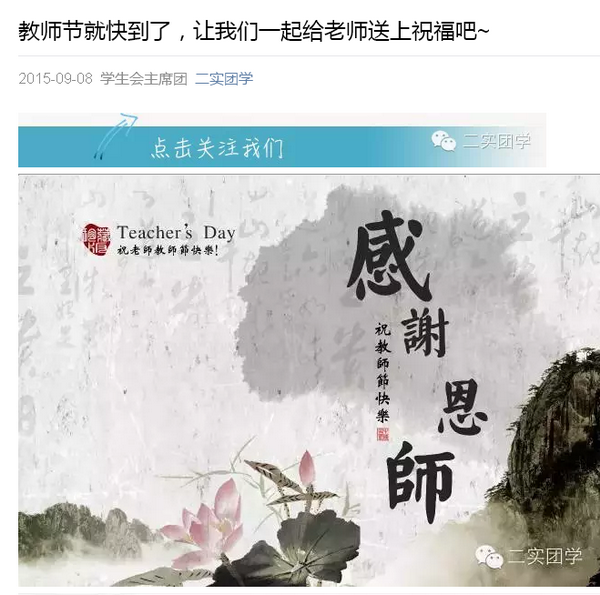 高中部校园的LED屏幕上,滚动播放着高中团委征集的同学们自己拍摄的祝福小视频,校园原生态的场景中同学们用朴素真挚的语言,表达着对老师的爱戴和感谢。这些祝福小视频还通过“二实团学”微信公众号在网上传播。上课铃声响起后,各个班级的同学们齐声向老师问好,“祝老师节日快乐!”“老师我们爱您!”洪亮的问候声烘托出了节日的气氛。一些还没有到大学报到的2015届毕业生也返校看望老师,他们每人在门卫室领到一枝鲜花,用来向老师表达节日的祝福。
