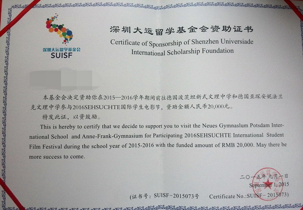 深圳大运留学基金会经过资质初审、评审组评审、理事会审议、网上公示等程序,确定了2015年的资助名单。我校高二年级赵海灵、靳紫馨等10位同学在德语老师郑远佳、信息技术老师赵振囡指导下,师生12人成功申请到高中生短期出国交流项目总计24万元奖金资助。该奖金将用于项目组师生赴德国柏林参加2016年SEHSUECHTE国际学生电影节以及访问伙伴学校亚琛安妮法兰克文理中学和波茨坦新式文理中学的项目花费。