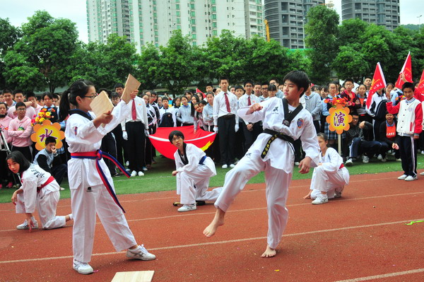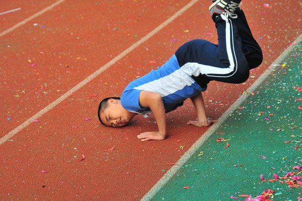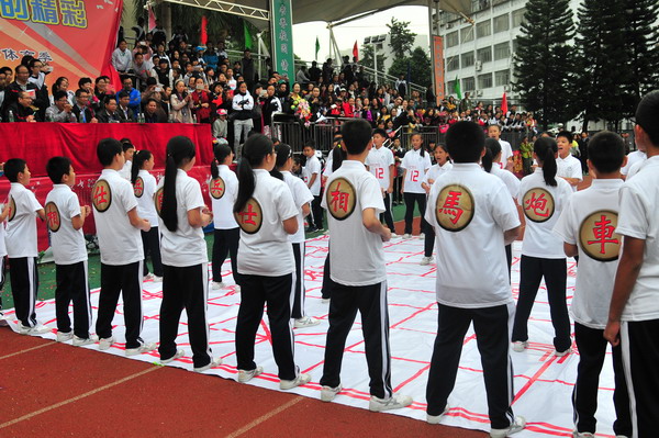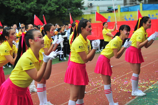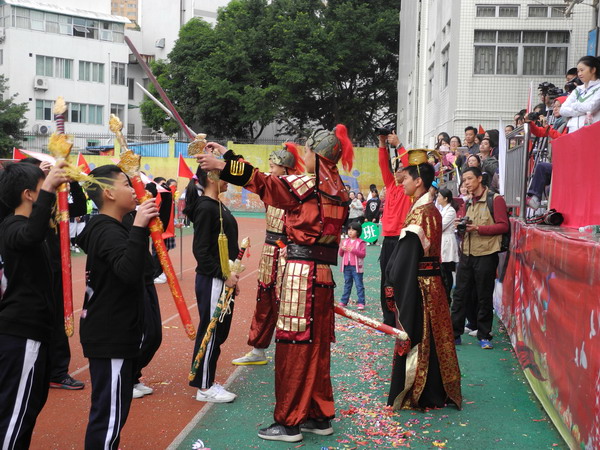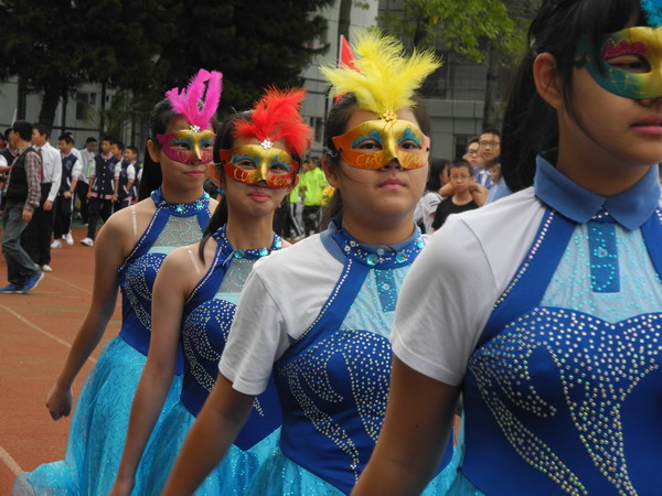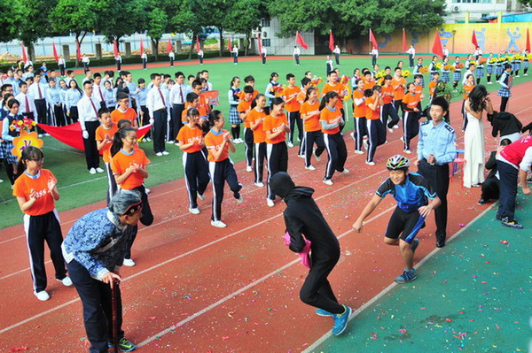 各班的表演有舞蹈、韵律操、表演唱、跆拳道、情景小故事,也有篮球、跳绳、毽球、骑行、剑术、翻跟斗等动作表演,憨态可掬的卡通萌宠、装扮灵异的动漫少女、英姿飒爽的“海军士兵”甚至峨冠博带的“汉武帝”也来到了现场助威,初一(12)班还在“咚咚”的战鼓声中展开了楚河汉界上的厮杀……精彩纷呈的入场式吸引了无数的镜头,赢得了观众热烈的掌声。