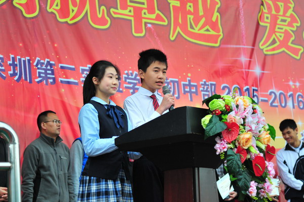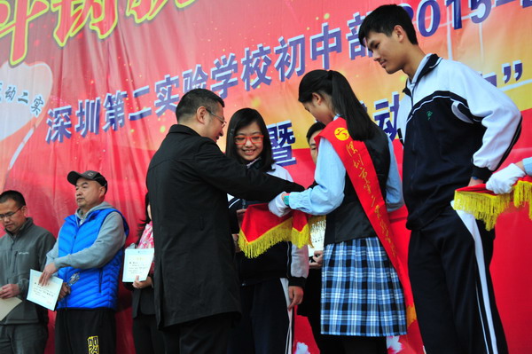 颁奖典礼上,学生主持人致颁奖辞,我校李雅萍副校长、郑向东副校长、冯大学副校长、党办陆林主任等校领导向7位“感动二实”2015年度人物颁发证书和奖杯。在初中部颁奖典礼上,7位获奖者真诚感谢学校给予自己的荣誉,感谢师生的认可、支持和帮助,表示将一如既往,继续努力,为“二实”的发展发挥个人最大的力量。高中部颁奖典礼上,曾志辉老师分享了援疆支教的感受,鼓励同学们在深圳优越的学习生活环境中勇于克服困难,不断超越自我;叶坤镇校友对母校今天的发展深感欣慰,祝福师弟师妹们在学校所创造的优良环境中努力学习,在学校搭建的各种成长平台上积极发展自我,不负青春时光,学有所成,也为母校争光添彩。