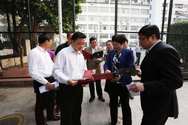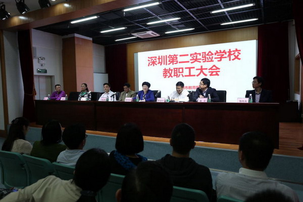 会议在初中部阶梯教室召开,深圳市委教育工委书记、市教育局党组书记、局长郭雨蓉以及市委教育工委范志刚副书记、市教育局组织人事处钟志红处长等领导莅临。会议由钟志红处长主持。
