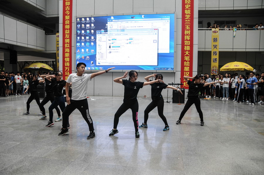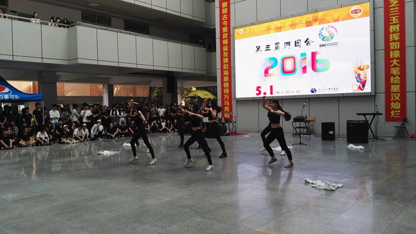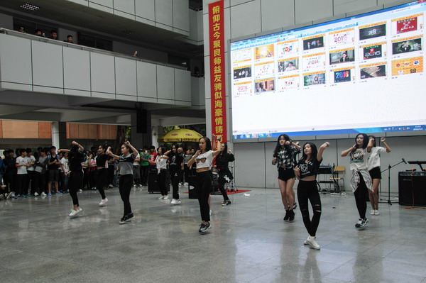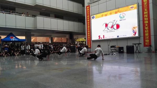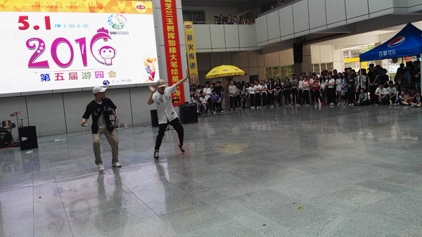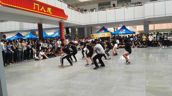 游园会现场熙熙攘攘,人气最旺的当属教学楼中厅的社团才艺展演,堪称全市各中学社团的才艺大PK。表演现场虽没有华丽的舞台,却在随意与率性中洋溢着火热的青春激情。里三层外三层的观众或坐或站,手持各式相机、手机,寻找合适的角度聚焦场上的表演,在雷鸣般的掌声和喝彩声中试图捕捉到最精彩的瞬间。二实乐队和街舞社主场作战,声情并茂的演唱、配合默契的乐队以及街舞表演中娴熟灵巧的翻滚、倒立、弹跳等高难动作引起了粉丝们的阵阵尖叫;育才中学、福田中学、市二高、梅林中学、罗湖外国语学校、行知学校、翠园中学等10余所兄弟学校的K歌社、乐队、街舞社、魔术社也倾情出演,由罗外、深大附中、红岭中学、博伦职校、二实学生组成的深圳bbox联盟更是联袂演绎出深圳中学生的跨校友谊,奔放的歌声、动感的舞蹈、优美的旋律、独特的编排,诠释出同学们无限的青春活力和令人震撼的才艺创意。