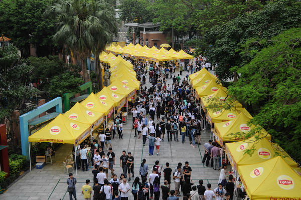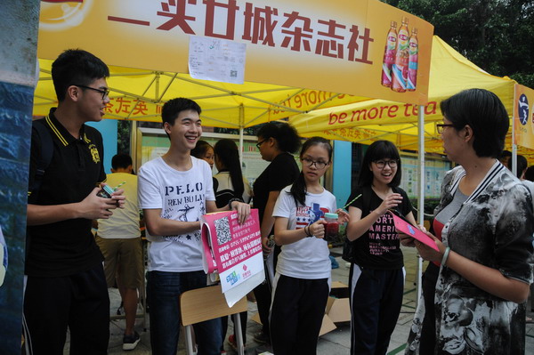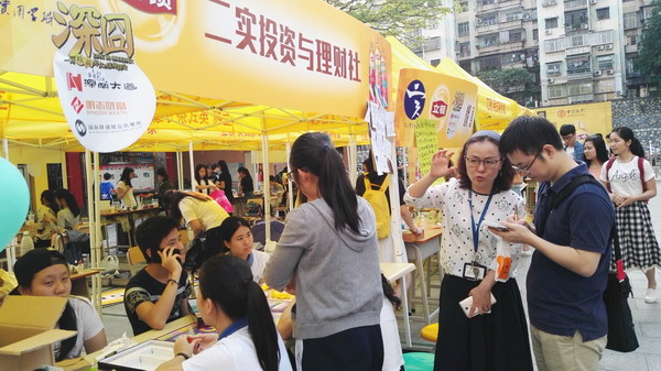 鳞次栉比的黄色展棚下,70个摊位有序排开,吸引来了涌动的人潮。这里也成了二实社团展示风采的绝佳阵地。《廿城》杂志社坚持精神文明、物质文明“两手抓,两手都要硬”,不仅卖力兜售最新一期的《廿城》杂志,还吆喝着自制的特色小吃;科技环保社的同学们在小小的玻璃瓶中用营养液培植出了刚萌发嫩芽的各种植物,热情售卖的同时不忘宣传环保理念;投资理财社的同学们抓住这宝贵的机会,打出广告售卖原二实校长、现深中校长赵立亲笔签名的书籍《富爸爸,穷爸爸》,现场演示现金流游戏传播财商理念,还在指导老师——二实财务财产办公室李玲玲主任指导下练习做财务报表;纸艺社的女孩子们亲手制作了一盒盒五彩缤纷的花朵,巧手编织出一条条精致的纸手环,再加上大胆热情的推销,让前来采访的记者也赞不绝口,购买了手环、饰品带回家送给自己的女儿;校园电视台的小记者、小摄影师们扛着器材现场拍摄游园会的宣传视频,在络绎不绝的人群中随机找出合适的拍摄场景和采访对象,体现出了媒体行业的专业性、敏感性、灵活性。