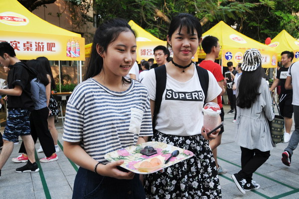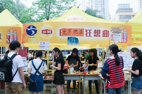 还有一些社团另辟蹊径,开设“软陶小铺”“桌游吧”“百年老店”“太阳的美味”“多肉的花园”,高悬“床没帮”“你咋不过来呢”“克罗地亚狂想曲”诸如此类让人闹不明白而欲探究竟的摊名,售卖小盆栽、手链、手工制品、面具之类的物品或者自制冰淇淋、棉花糖、寿司、果汁等特色小吃,打出五花八门招人眼球的广告,有的同学还穿上了汉服,画上了彩妆,真可谓八仙过海,各显神通。